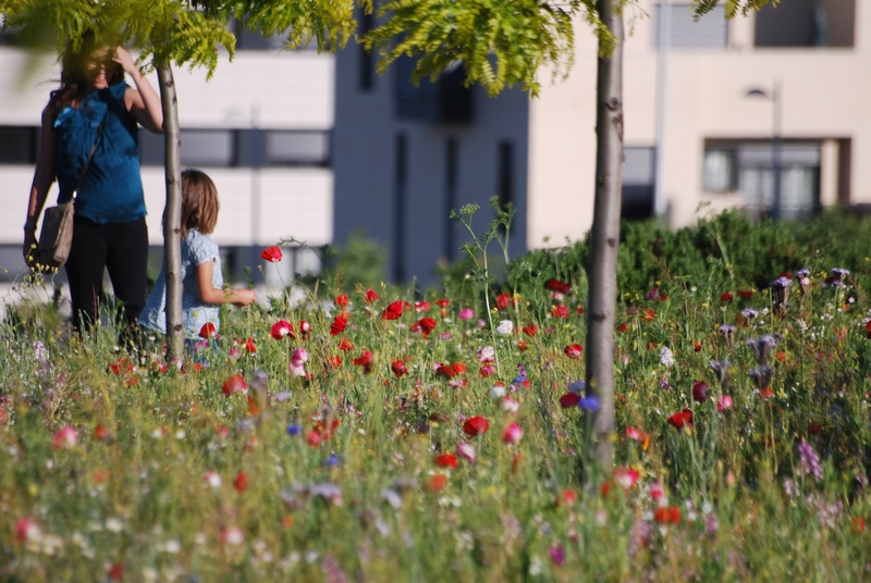 Hoy volvemos a dar un buen paseo por praderas de flores, esas coloridas alfombras que tanto nos atraen (a los insectos también), pero que a veces nos parece difícil de conseguir en jardinería, pública y privada.