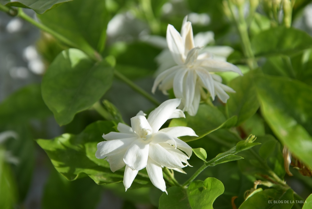 De los tres jazmines que tengo, el más florífero siempre es el jazmín español (Jasminum grandiflorum), pero los más perfumados (y qué maravilla de perfume) son Jasminum sambac ‘Duque de Toscana’, que este año ha florecido bien, aunque no ha estado demasiado vigoroso, y Jasminum sambac ‘Belle of India’, que ha crecido más sano y me ha regalado un millón de fragantes flores (aproximadamente…).