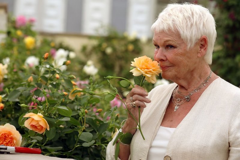 Dame Judy Dench con la rosa David Austin que lleva su nombre •• RHS