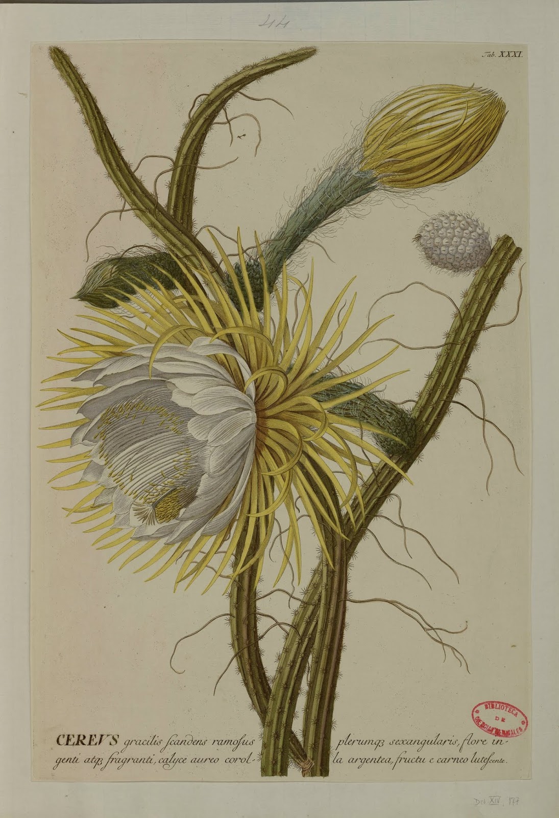 Cereus gracilis scandens ramosus (Cactaceae) • Georg Dionysius Ehret, 1708-1770 Estampa calcográfica iluminada • Colección Jan Le Franq van Berkhey. Archivo RJB-CSIC
