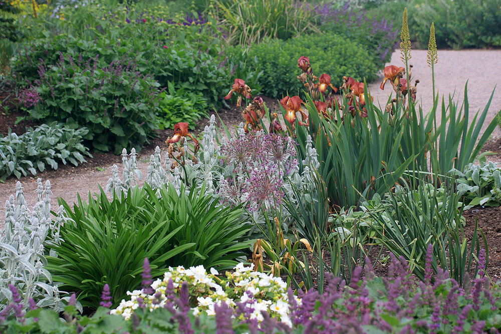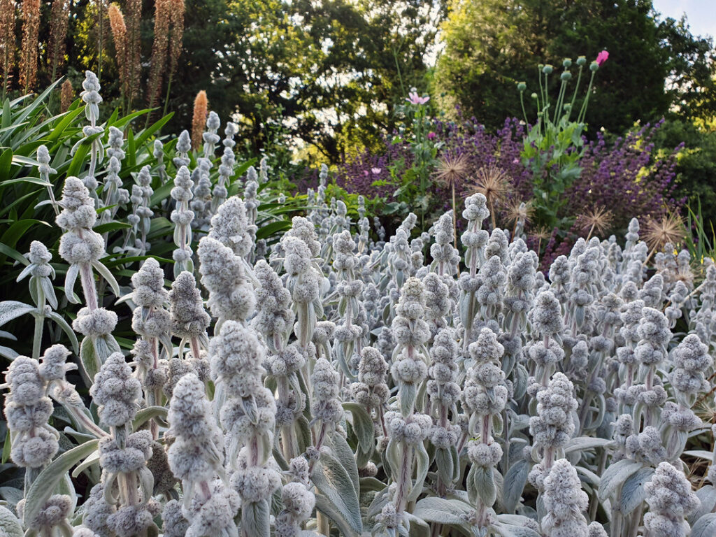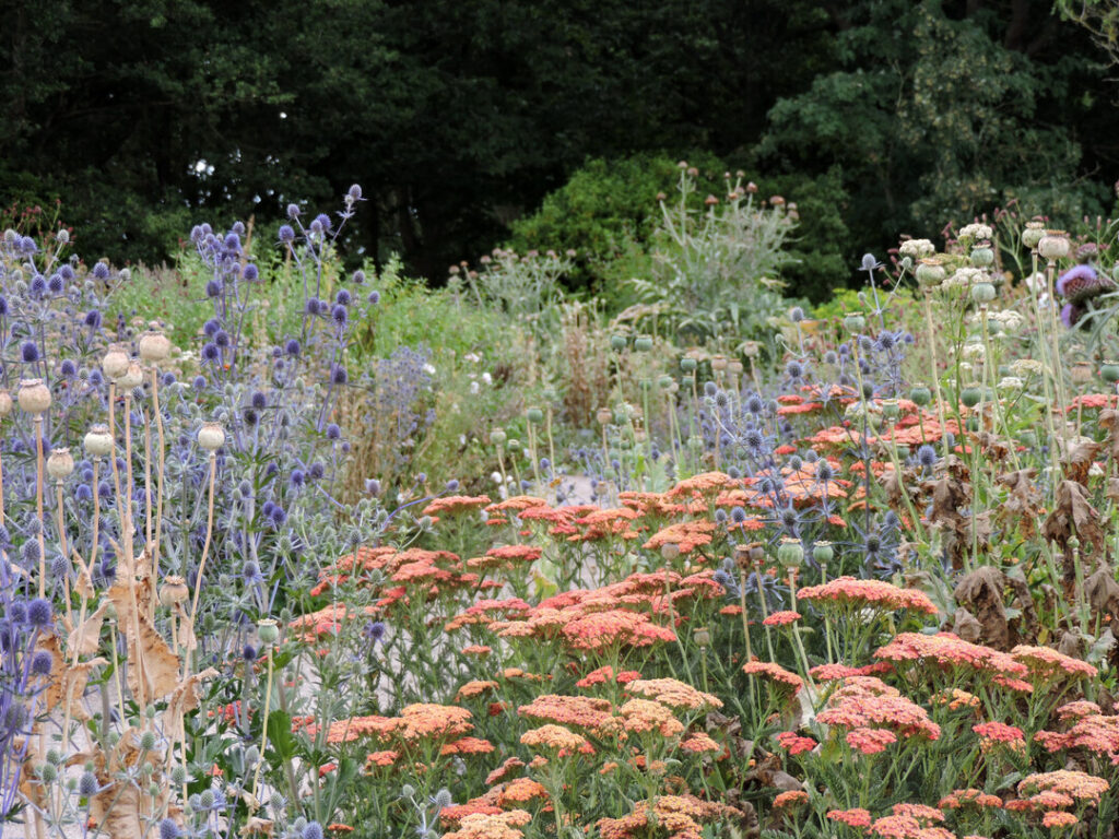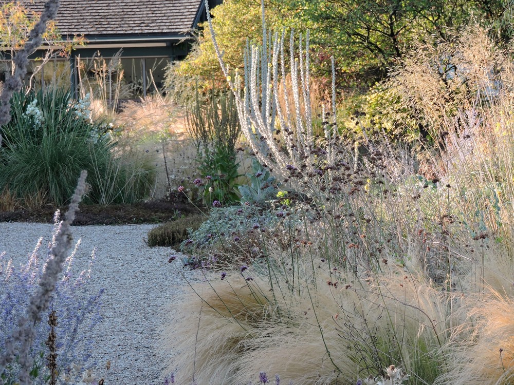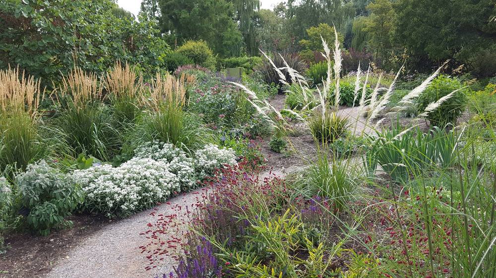 Phlomis tuberosa ‘Amazone’; Stachys bizantina; Eryngium planum ‘Blaukappe’ y E. paniculatum; Euphorbia cornigera y E. margalidiana; Oenothera lindheimeri (sin. Gaura lindheimeri); Salvia rosmarinus ‘Green Ginger’, S. verticillata ‘Purple Rain’ y S. x sylvestris ‘Blauhugel’; Verbena bonariensis y V. macdougalii ‘Lavender Spires’; Persicaria amplexicaulis ‘Arend Stolz’; Centaurea ‘John Coutts’; Cephalaria gigantea; Limonium platyphyllum ‘Violetta’; variedades de especies aromáticas de Melissa y Origanum; y diferentes variedades de Kniphofia, Achillea, Agapanthus entre otras plantas herbáceas perennes tolerantes a la sequía.