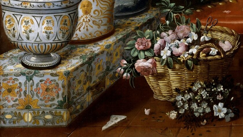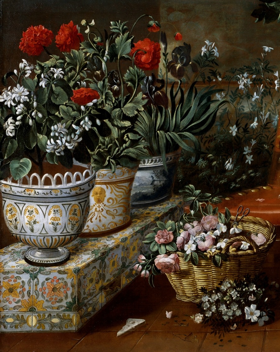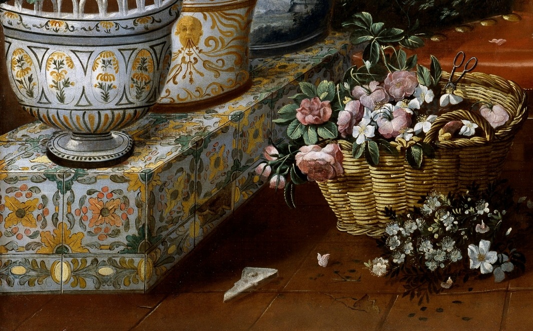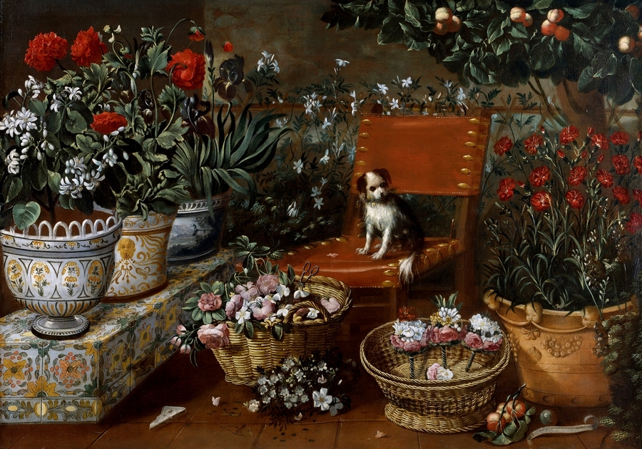 La obra forma parte de la colección del Museo del Prado en Madrid y la describen como un delicioso patio ajardinado donde encontramos un largo banco ennoblecido con azulejos de cerámica sobre el que aparecen grandes macetas, diferentes entre sí, con una bella decoración también de cerámica multicolor. En esas macetas crecen diferentes plantas fanerógamas o espermatofitas (plantas vasculares que producen semillas); dos cestos, uno con flores y el otro con ramilletes que evocan las biznagas (ramillete de jazmines en forma de bola de laboriosa elaboración que en verano se suelen vender por las calles de Málaga, España) ; flores por el suelo; un gran macetón con clavelesy un árbol con frutas, todo centrado por un sillón de madera y cuero, sobre el que luce, frágil y diminuto, un gracioso perrillo, ajeno al ubérrimo entorno que le rodea por doquier”