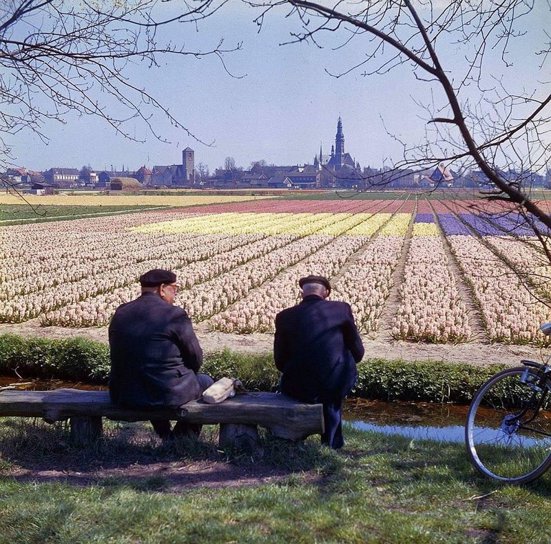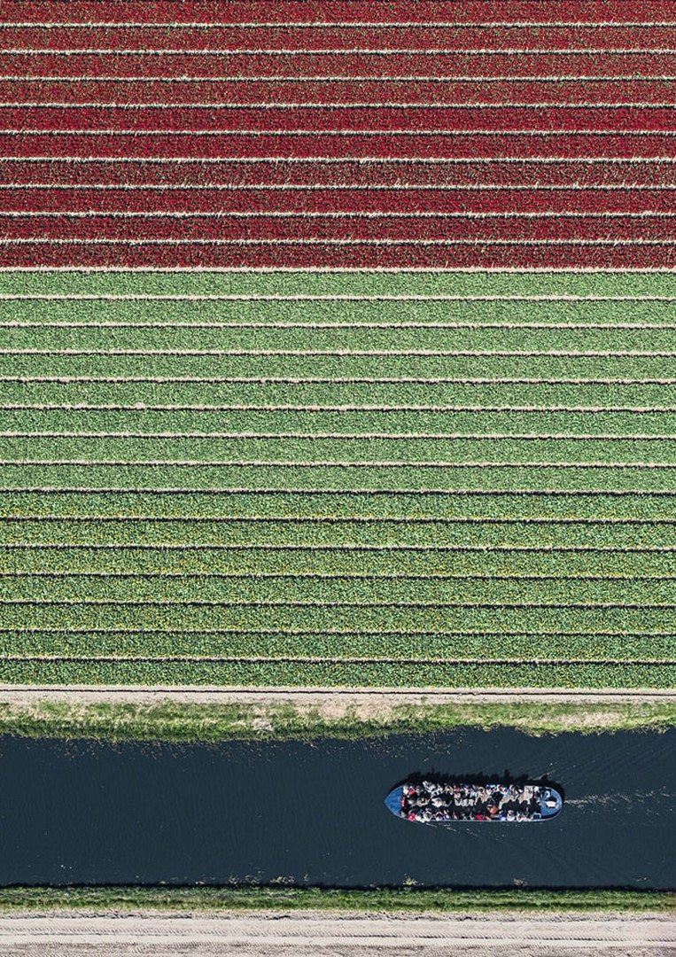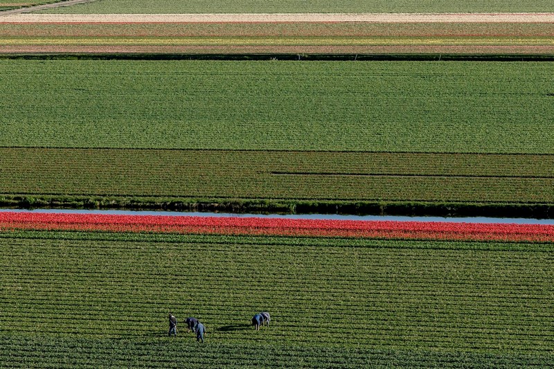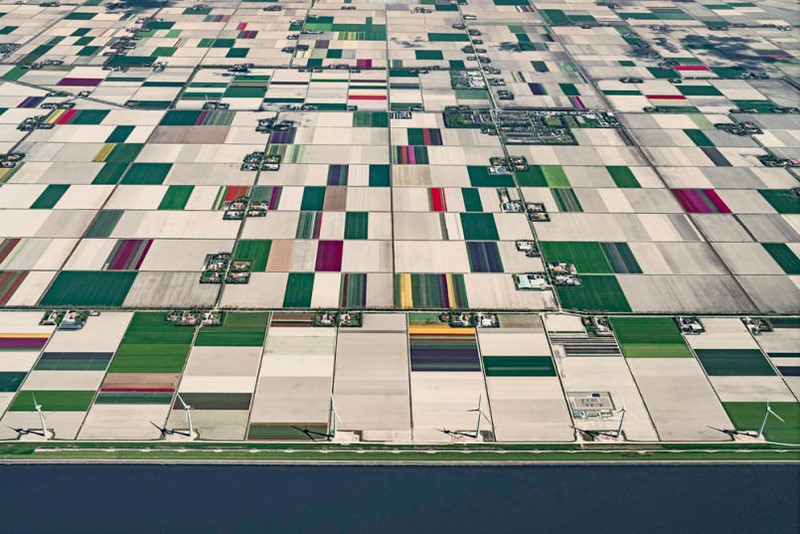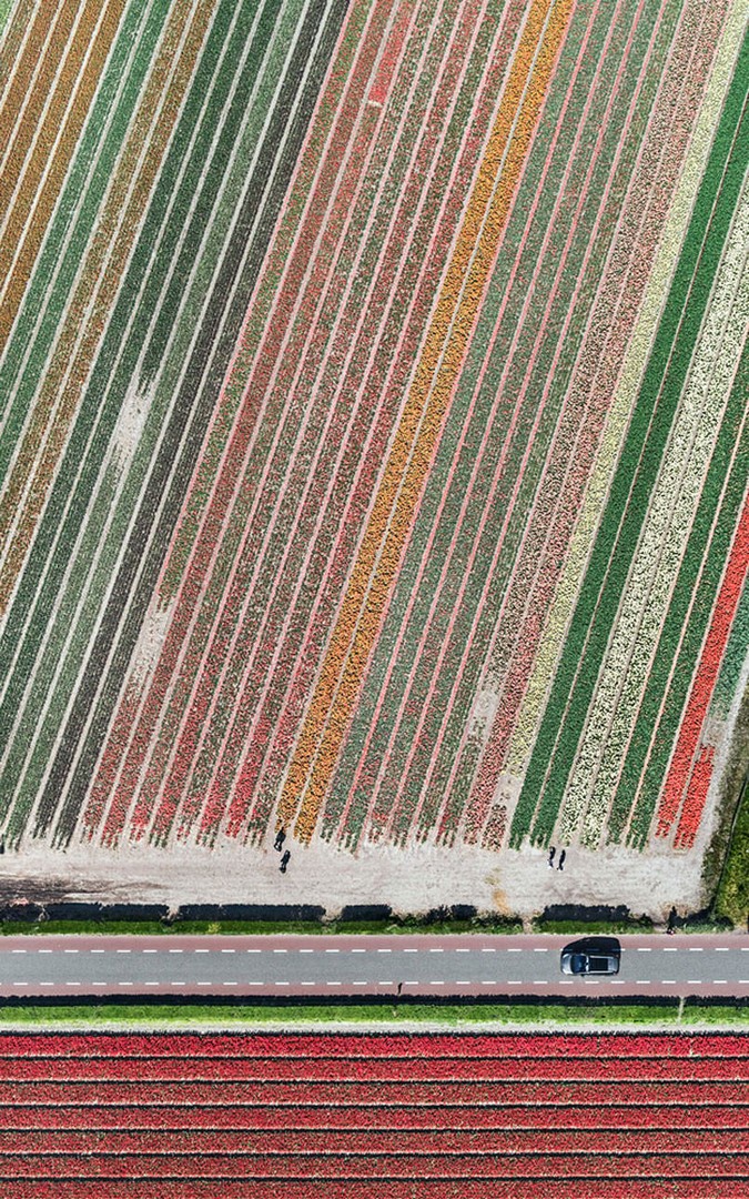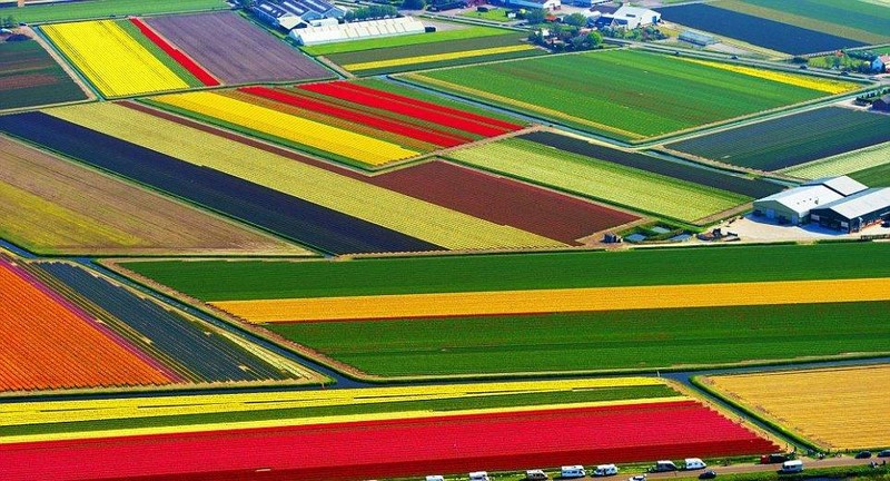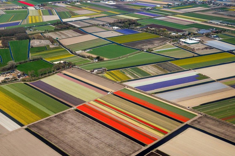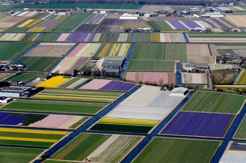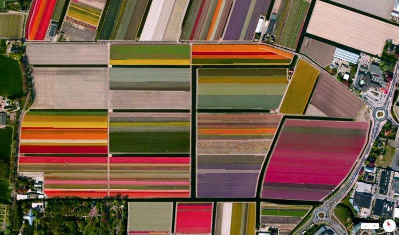 Mondrian recreaba paisajes planos, geométricos, en calma. Líneas rectas y superficies que dibujan campos de color. Lo que inevitablemente nos traslada al entorno de Keukenhof: los campos de cultivo de tulipanes y otros bulbos de flor. Líneas y planos geométricos, como si de una operación matemática se tratara; unido a colores intensos.