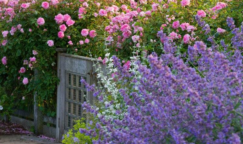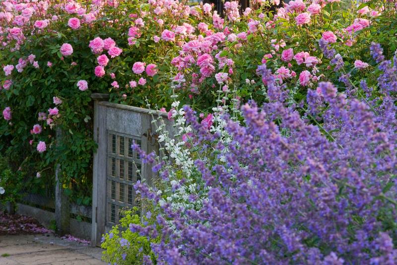 La foto de la portada de hoy, de Clive Nichols, está hecha precisamente en el cottage garden, donde se aprecia un seto con rosas inglesas que parecen querer alcanzar el cielo. Concretamente Rosa ‘The Mayflower’, un rosal arbustivo criado por David Austin que produce desde el inicio de la temporada flores de color rosa muy fragantes. Repite floración y es muy resistente a enfermedades.