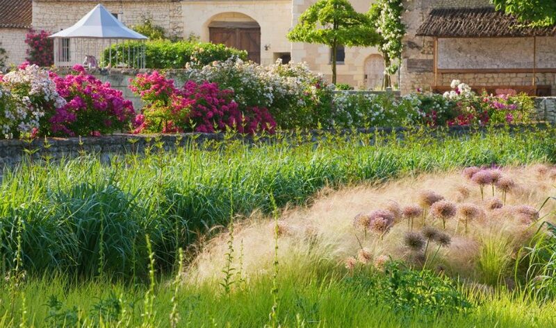 Hoy os regalo un castillo para soñar. Un castillo-museo situado en la comuna de Lémeré, en la región de Centro-Valle de Loira, Francia. Allí podemos admirar bellas rosas de color magenta en contraste con tonos suaves de otras plantas que las acompañan.