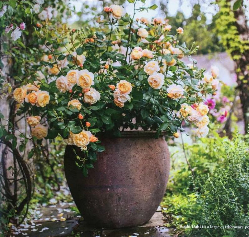 De eso quería hablar hoy, porque tengo que reconocer que me encantan las rosas en grandes macetones. En el libro sobre rosales ingleses que comenté en su día (The English Roses) aparece una foto en la que se puede apreciar la extraordinaria belleza de un rosal ‘Benjamin Britte’ cultivado en un contenedor grande de arcilla. Más recientemente, en el catálogo de rosas de David Austin para la temporada 2017/2018, también se puede ver un precioso macetón donde lucen espectaculares las flores de la Rosa ‘Roald Dahl’, presentada en Chelsea Flower Show 2016. Si ya me parecía hermoso ese rosal, al ver esa imagen me ha enamorado.