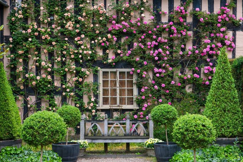 Con espinas y sin espinas, en amarillo o en rosa, pero siempre rosas perfumadas y de floración continua, trepando por fachadas o muros en Wollerton Old Hall Garden.