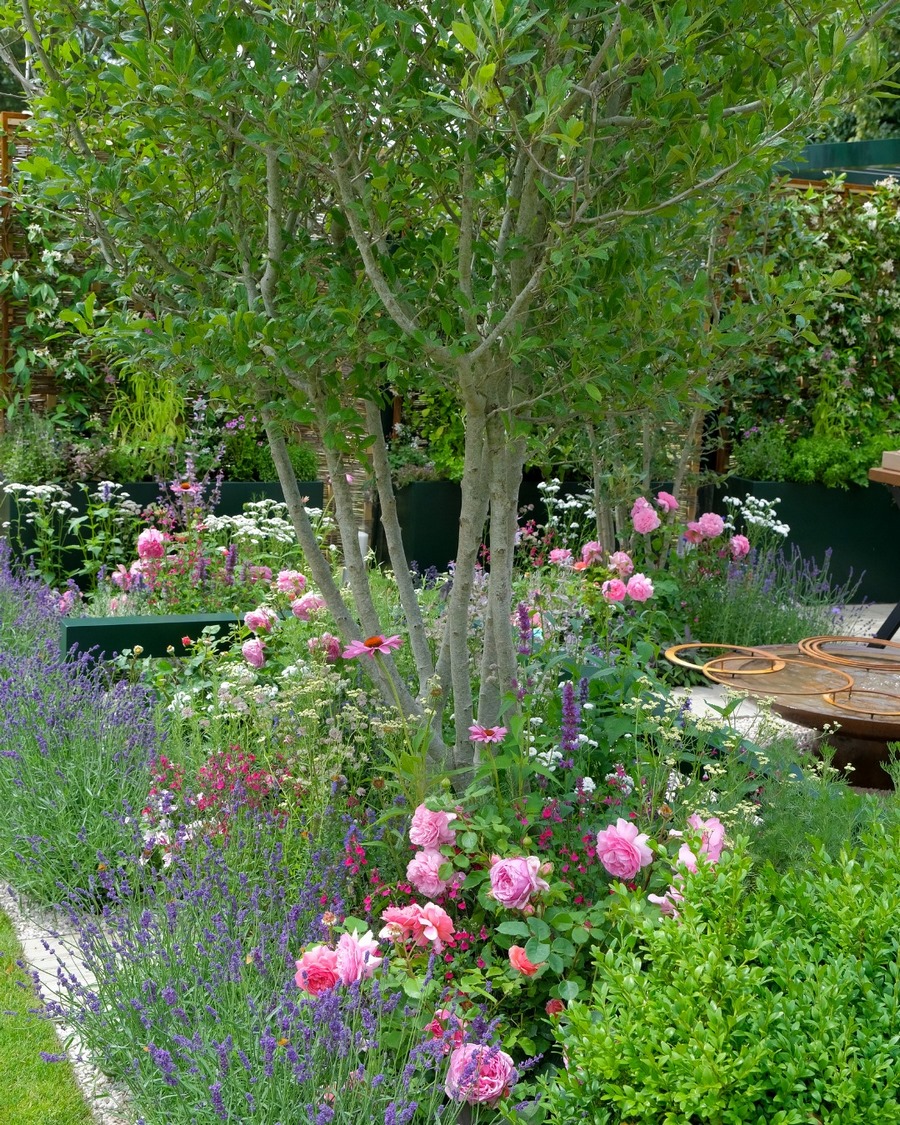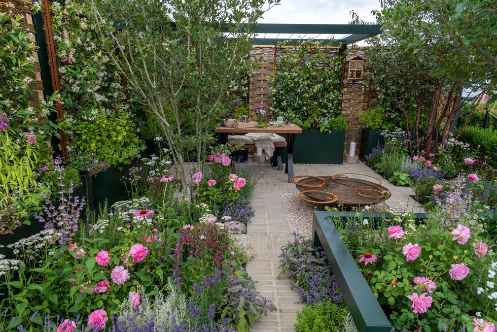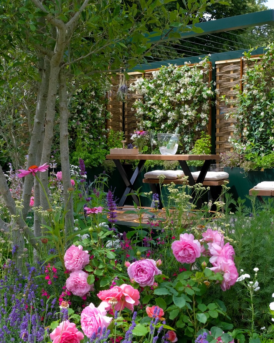 Se quería conseguir un espacio relajante seleccionando plantas por su aroma y belleza, y el resultado es un pequeño oasis sensorial donde las rosas brillan en compañía de otras plantas fragantes, en un jardín de exhibición que ha obtenido la medalla de oro en RHS Hampton Court Palace Garden Festival.