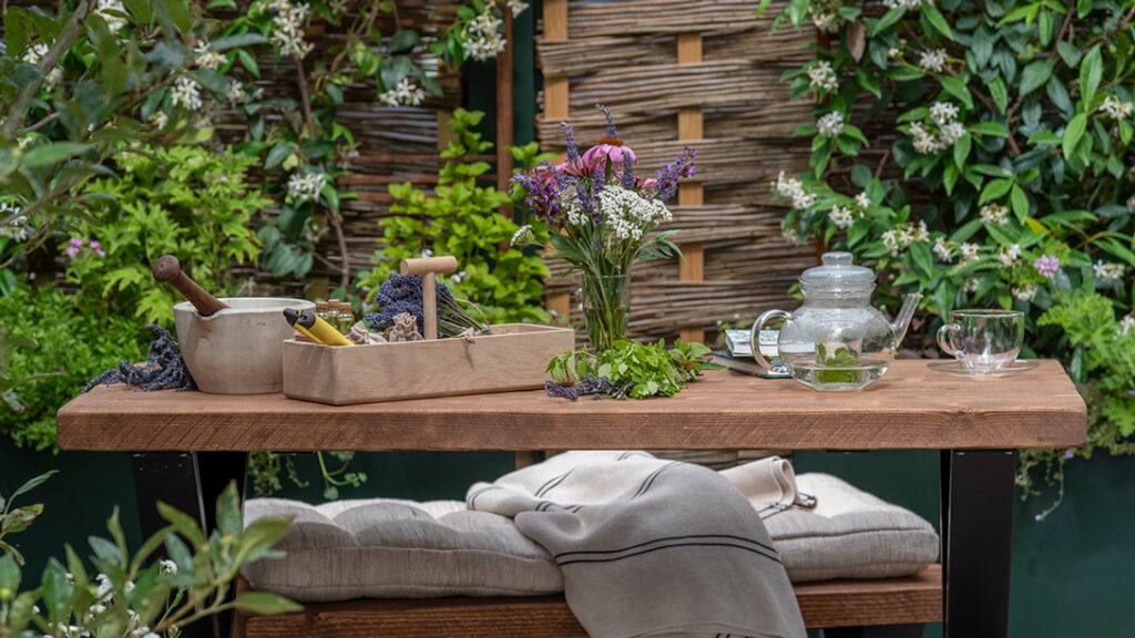 Ese lugar placentero que sugiere este jardín de exhibición tenía que incluir un espacio donde sentarse y relajarse. En este caso está situado en el corazón del diseño, y también representa lo que podría ser un área para experimentar con diferentes plantas útiles. Desde remedios herbales y tinturas, hasta el placer de tomar una taza de té de menta o manzanilla usando hierbas recién recogidas del jardín.