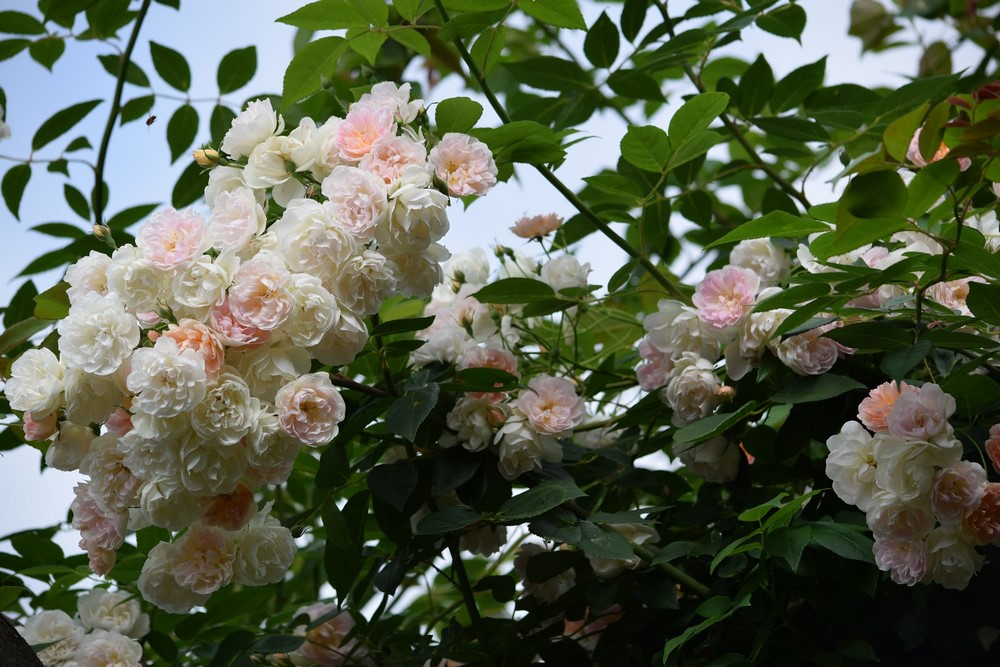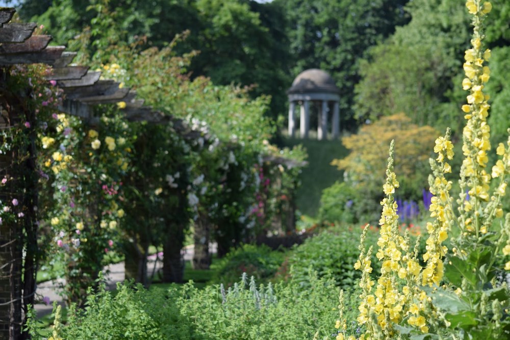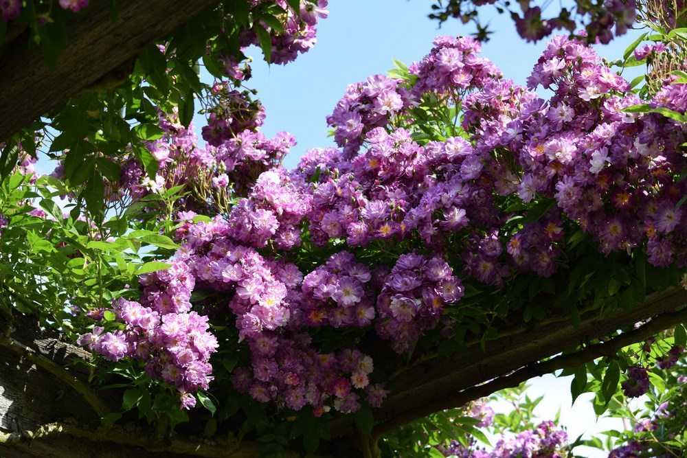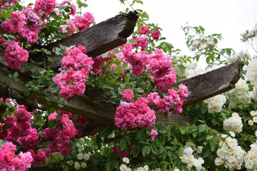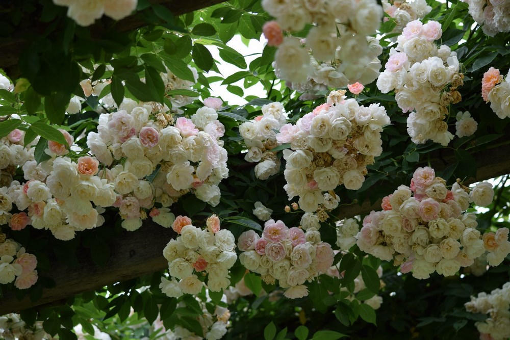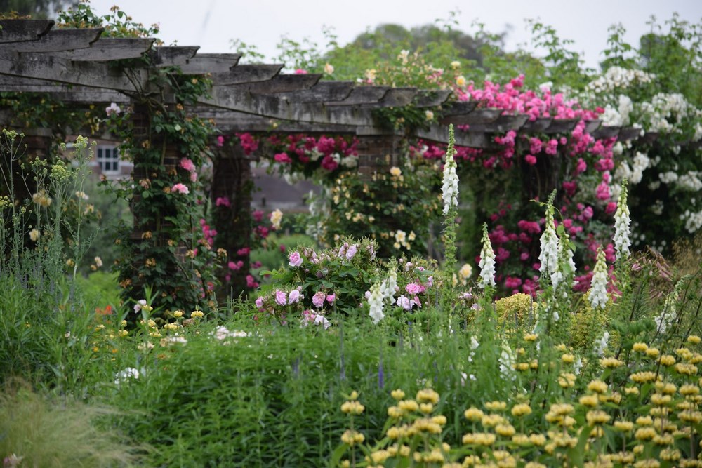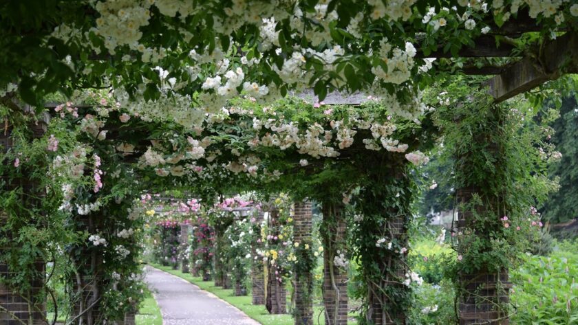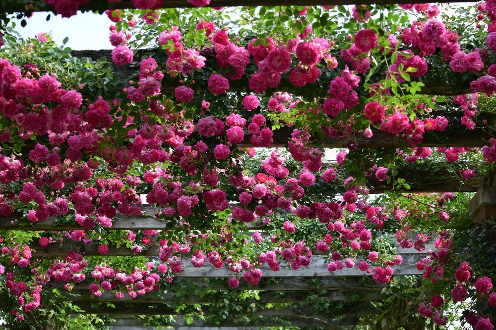 Las variedades de rosales que adornan (y perfuman) esa pérgola han sido seleccionados especialmente por su profusión y largo período de floración, tales como Rosa‘Chaplin’s Pink Climber’, R. ‘Alexandre Girault’, R. ‘Bobbie James’, R. ‘Chevy Chase’ y R. ‘Treasure Trove’. Al parecer, para el mantenimiento de estos rosales, la poda anual se inicia en septiembre y tarda cuatro meses en completarse. Un largo proceso, sí, pero el resultado no puede ser más espectacular.