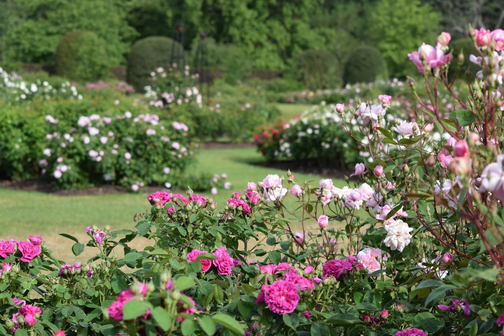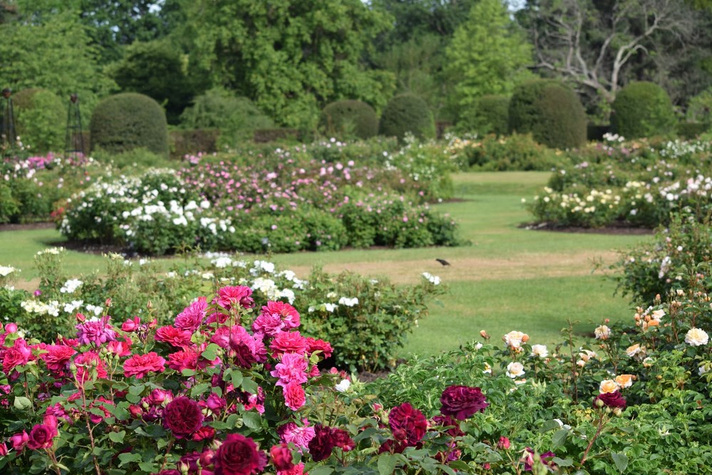 Gracias al regular pinzado de flores marchitas (deadheading) que se realiza semanalmente, consiguen una floración exuberante, que en muchos casos se mantiene hasta noviembre. El césped también se corta una vez a la semana, bordeando las camas de rosas, para lograr el máximo efecto visual.