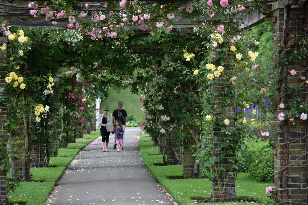 En los jardines de Kew hay un área llamada Plant Family Beds, que nada tiene que ver con las familias de los humanos, sino con las botánicas. En esa área existen 102 camas separadas donde se cultivan plantas que pertenecen a 96 familias botánicas diferentes, con el propósito de mostrar de qué forma se relacionan los diferentes géneros y especies entre sí. En perpendicular a esas camas, vamos a encontrar otra joya dedicada a las rosas: Rose Pergola.
