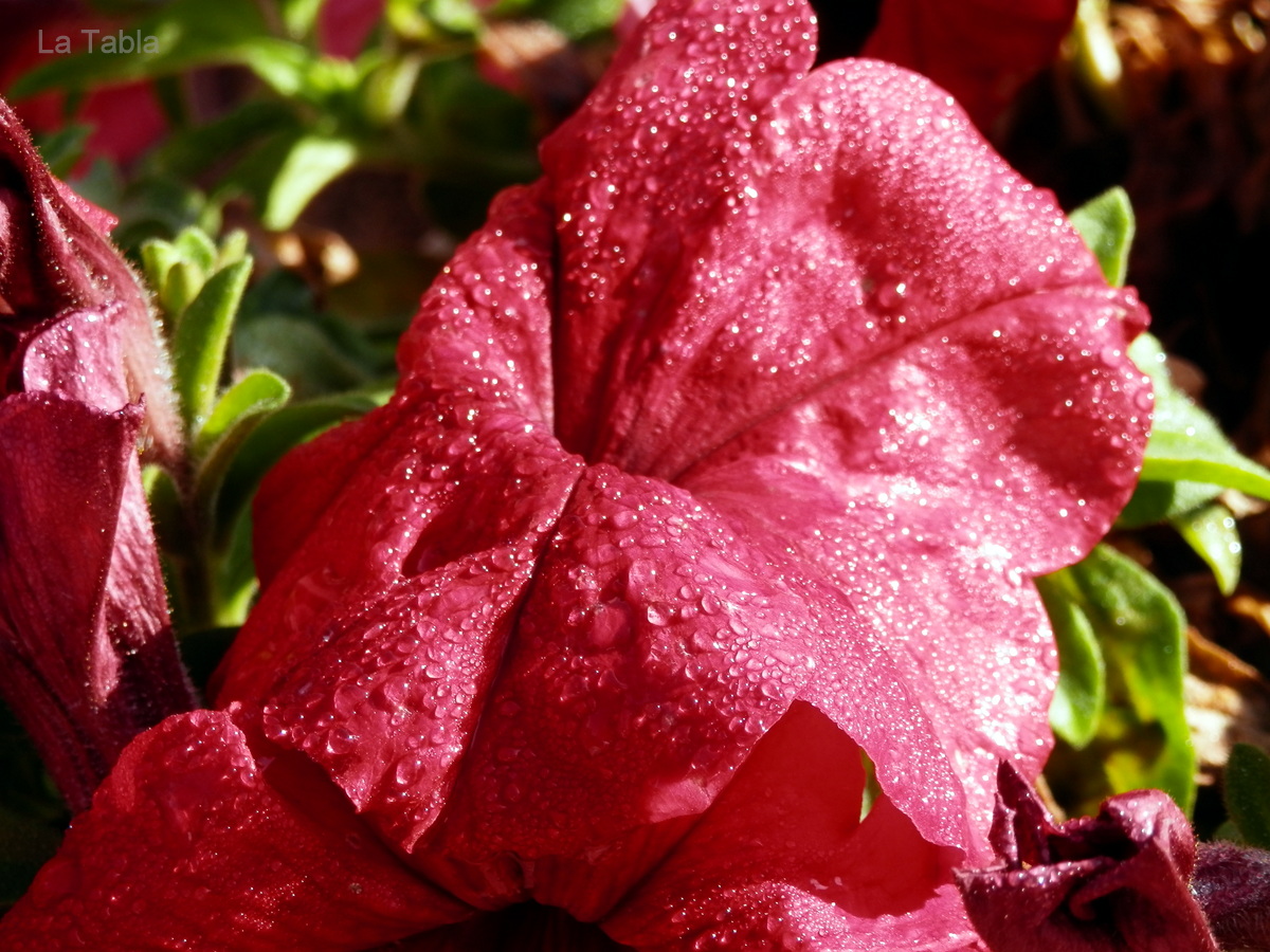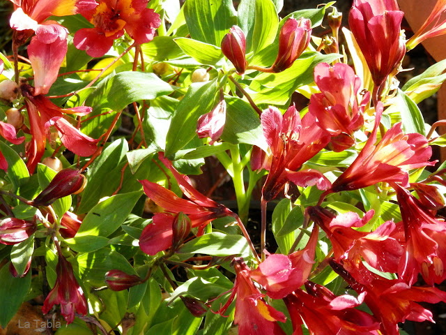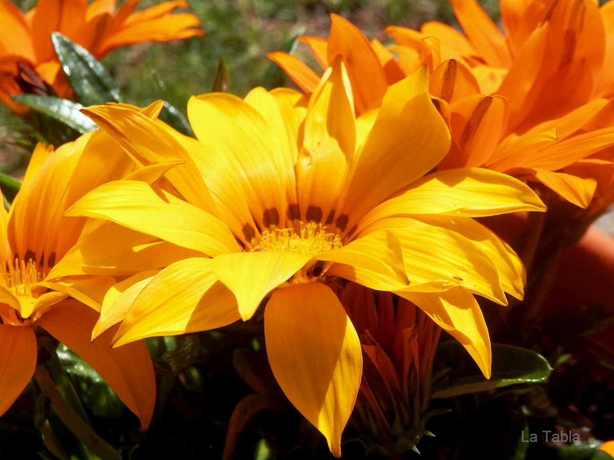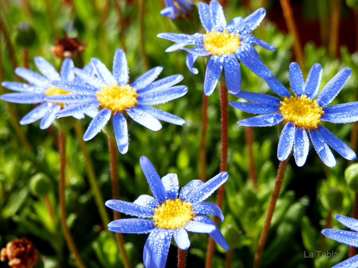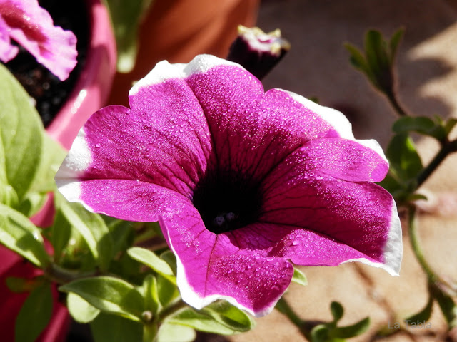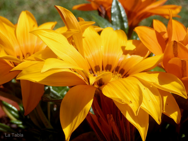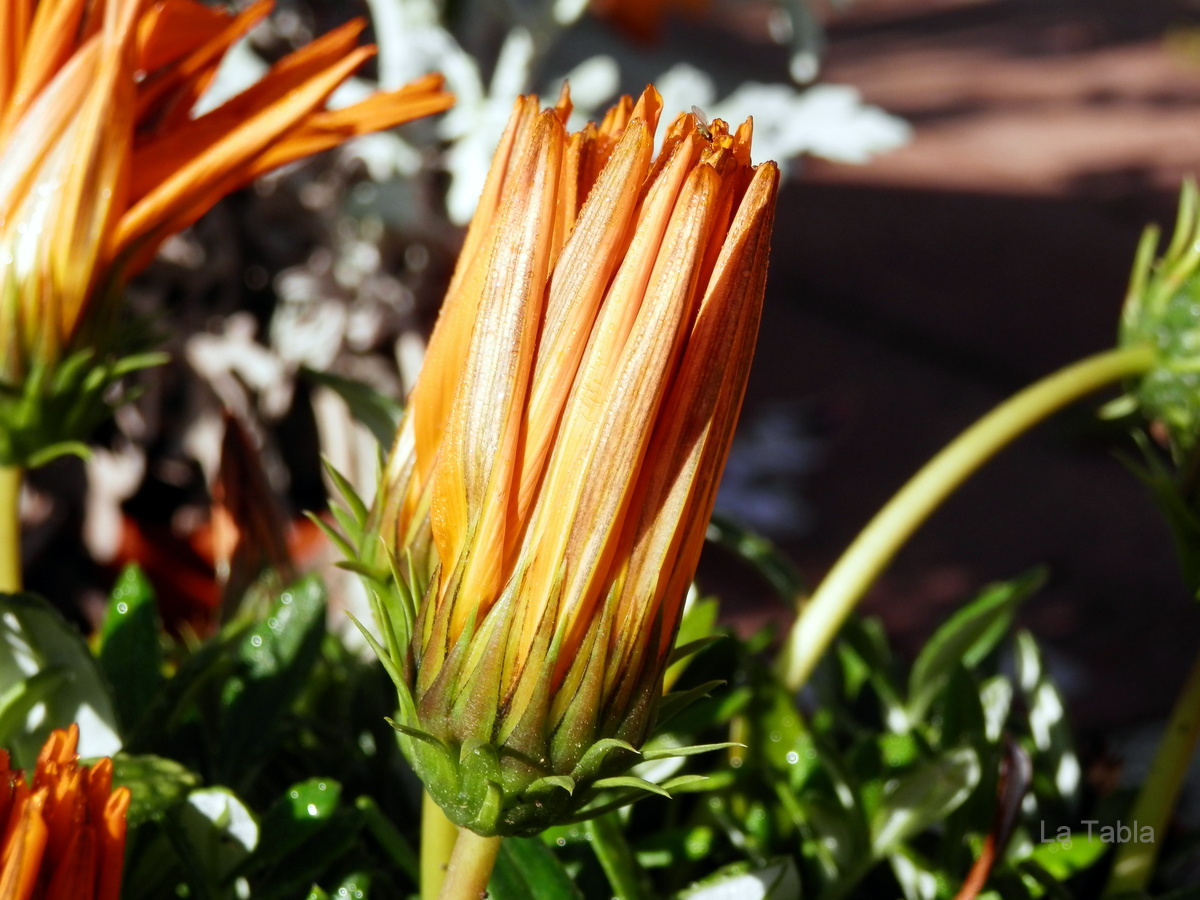 Después de la tempestad viene la calma ¡y el sol! que baila con las Gazanias y con todo lo que pilla por el jardín, fresco y ‘recien regado’. La luz a vuelto y las Gazanias lo anuncian a bombo y platillo. Las Surfinias se sacuden el agua, el Pelargonium grandiflorum todavía la retiene, la flor del cebollino guarda sus gotitas y así, poquito a poco, se van organizando todos, hasta la Verbena. Según escribo, vuelven las nubes, de modo que dejo estas imágenes a modo de recuerdo de un momento en el que brilló el sol y el jardín se desperezó.
