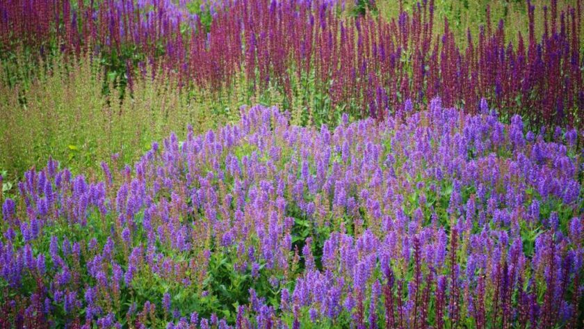- Salvia ‘Dear Anja’. Es una plántula obtenida de Salvia ‘Tänzerin’. Variedad seleccionada por Piet Oudolf y llamada así por su esposa. Tiene tallos oscuros y flores de color lila con un labio inferior más pálido. Alcanza una altura de unos 80 centímetros y florece en verano.
