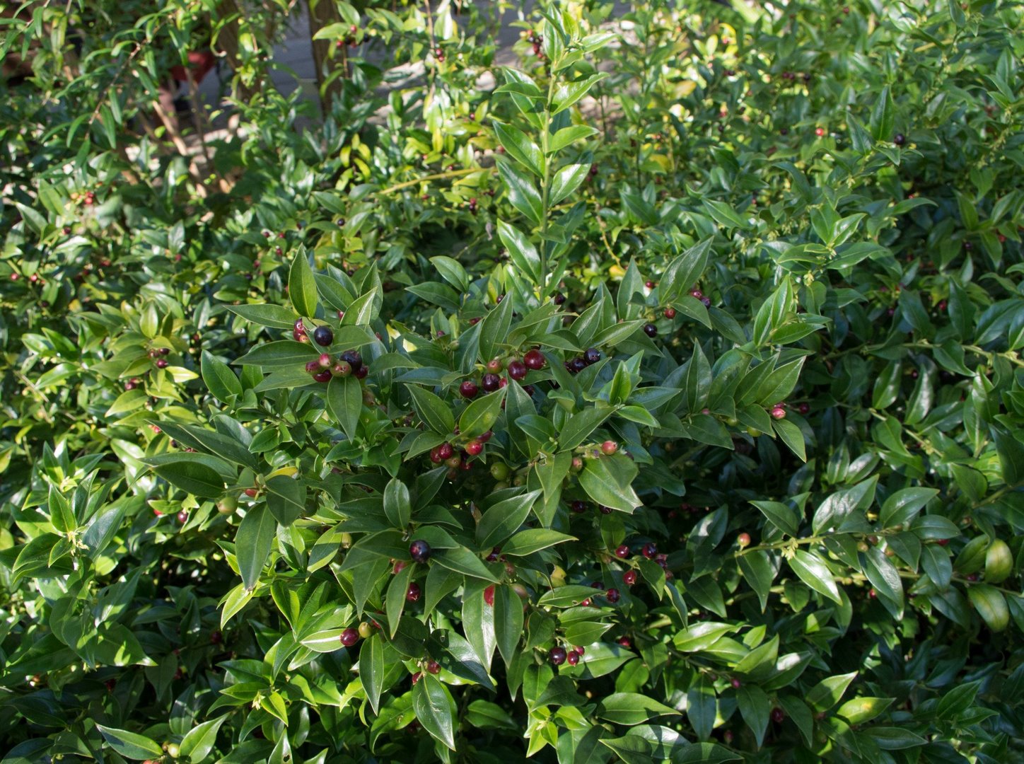 Arbusto de hoja perenne con tallos verdes o purpúreos, hojas delgadas de color verde oscuro y flores blancas fragantes, teñidas de rosa en invierno, seguidas por bayas de color negro azulado al final del verano. Altura y extensión: 1.5 m.