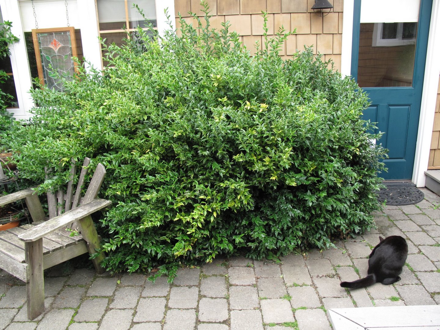 Arbusto de hoja perenne con hojas ovadas onduladas, de color verde intenso y brillante. Sus flores, muy perfumadas, son de color blanco cremoso en invierno, seguidas de bayas negras brillantes. Altura y extensión: 2 m.