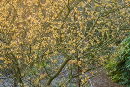 Las flores de color amarillo pálido del macasar (Chimonanthus praecox o fragans) emiten una penetrante fragancia capaz de perfumar el jardín en invierno