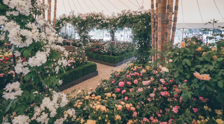 Arcos y pérgolas de madera y una mezcla colorida y perfumada de rosas inglesas realmente …