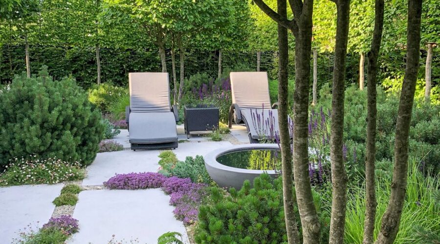 Un jardín de agua con cuatro estanques y plantas amantes de la humedad que proporcionan una sensación de exuberancia tropical