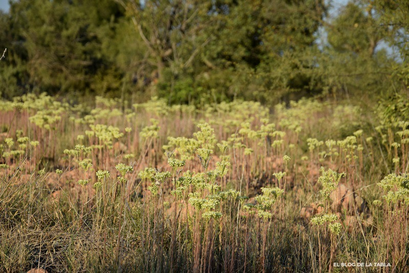 Hoy vuelvo a fijar mi atención en esta planta que tanto admiro y tanto abunda en esta zona, pero en esta ocasión lo hago para hablar de las inflorescenciasque se forman en la parte superior de los tallos y que se componen generalmente de varias ramas (4-6), dispuestas como los radios de una rueda, con flores hermafroditas de color blanco-amarillo, que al atardecer se vuelven casi fosforescentes.