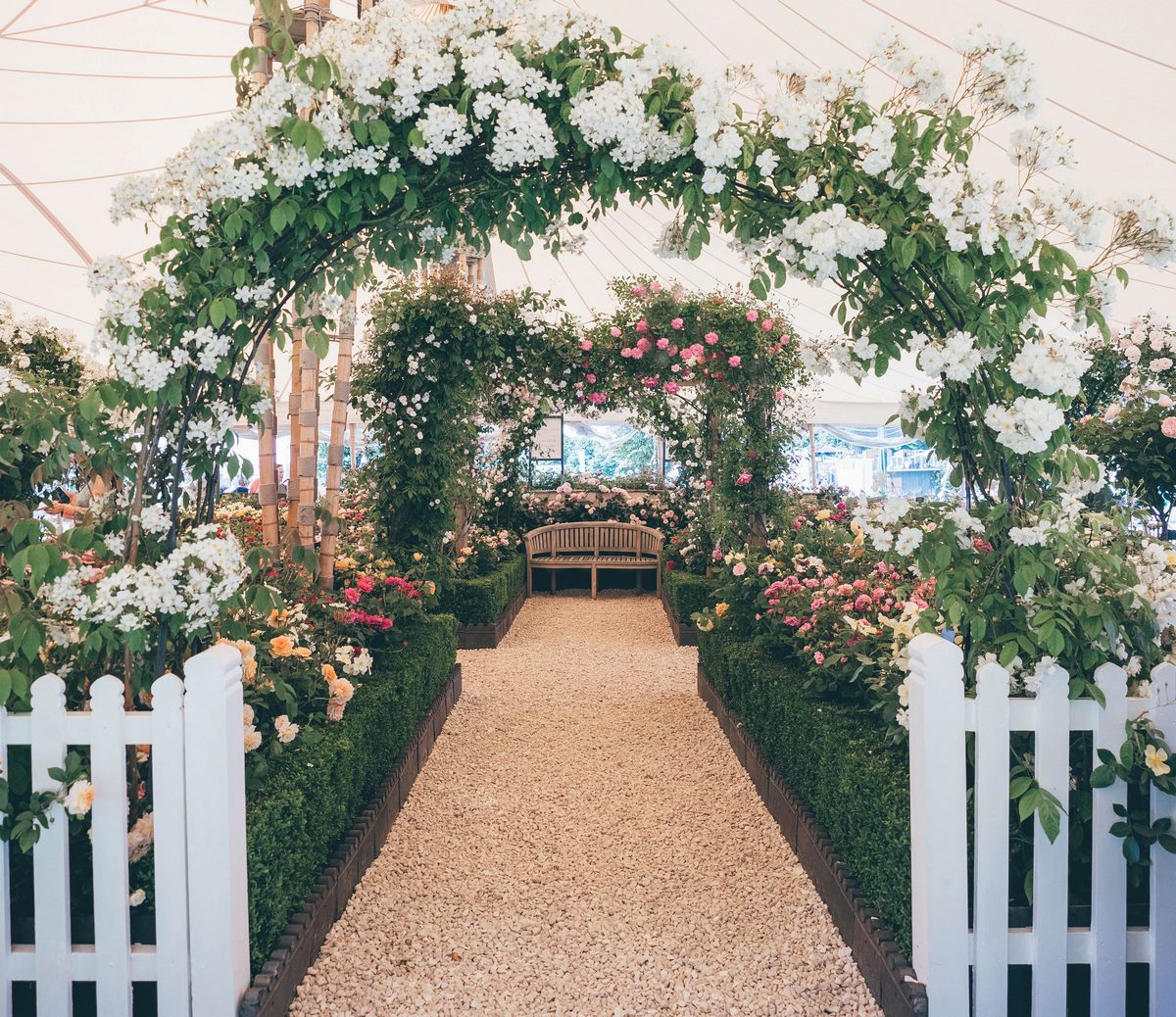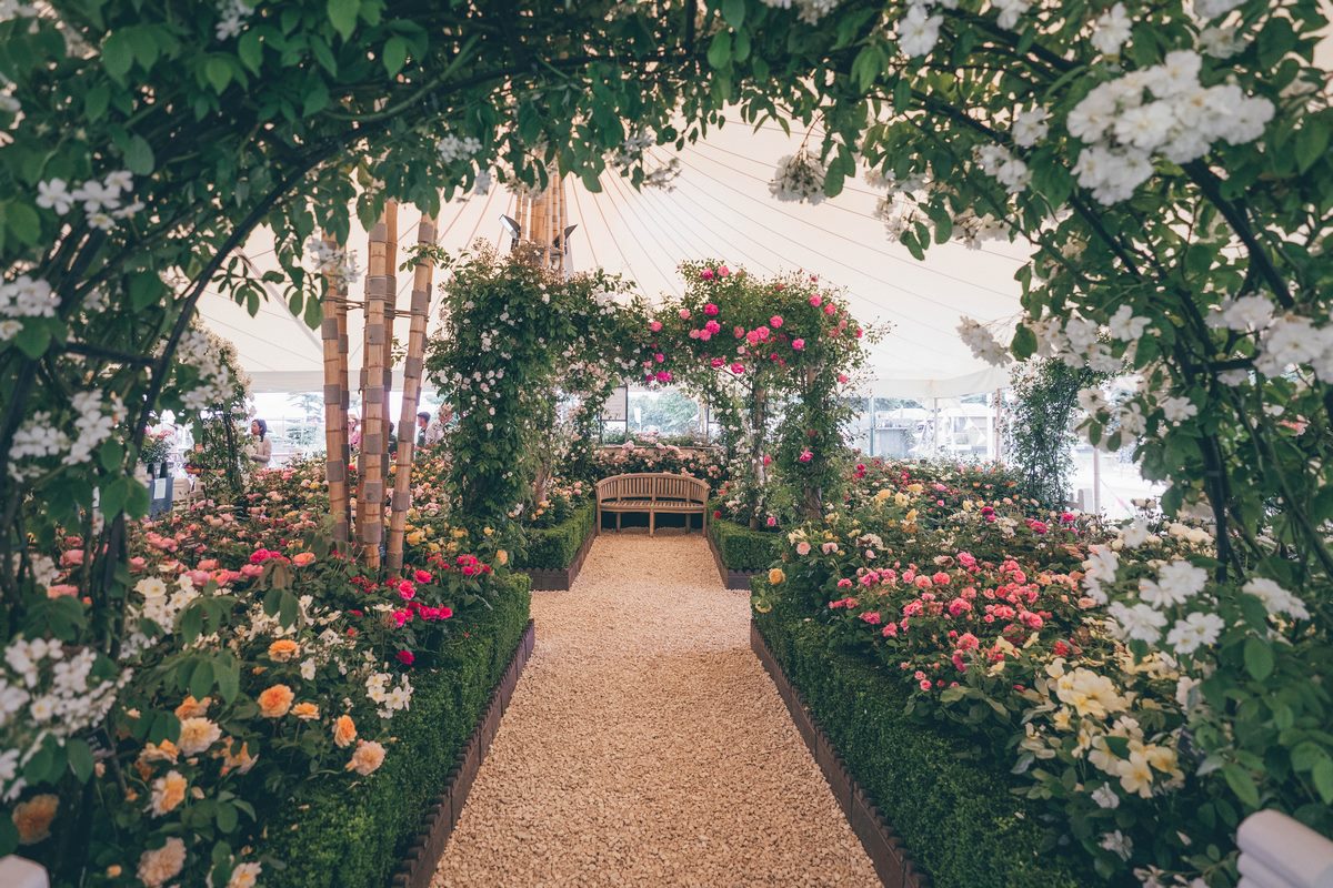 El jardín de exhibición de rosas de este año cuenta con un fragante camino central, flanqueado por cuatro camas cuadradas. Un sendero conduce a un lugar tranquilo, donde se puede disfrutar de la vista del jardín desde un banco de madera ubicado debajo de un magnífico arco.