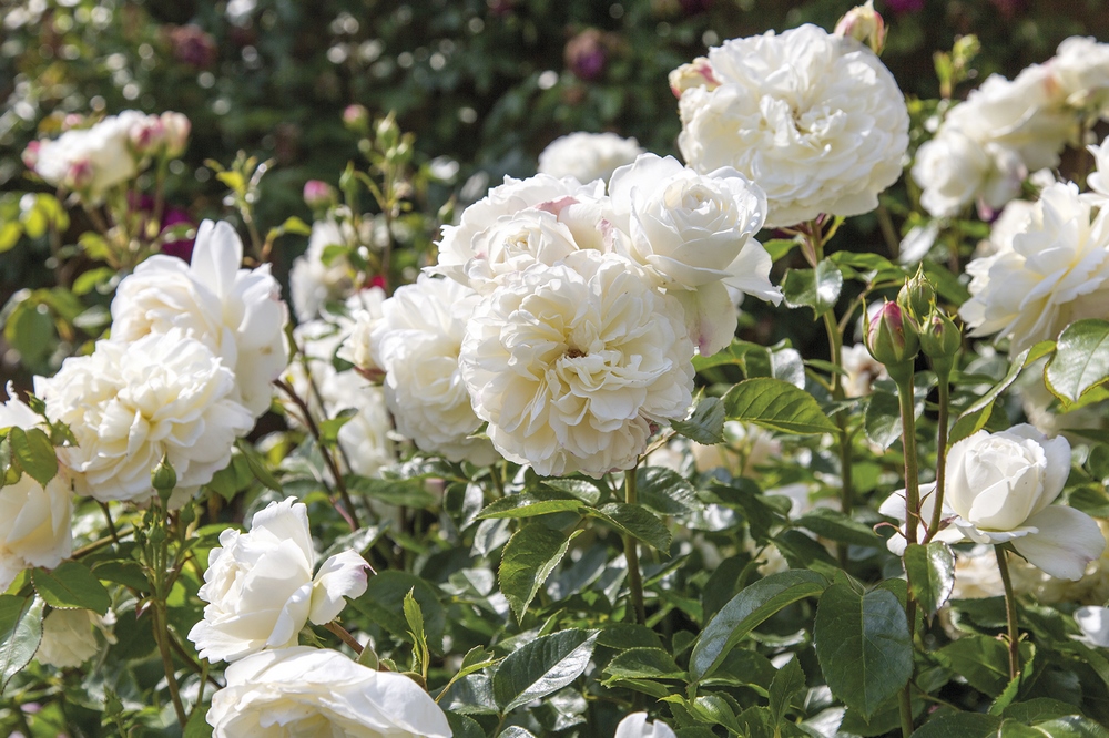 Flores bellamente redondeadas, con pétalos bien colocados que forman rosetas perfectas. Los cogollos están ligeramente teñidos de amarillo, pero cuando las flores se abren, se vuelven blancas. Una variedad vigorosa; su crecimiento es tupido y vertical, en este caso en forma de árbol, vestido con un follaje verde claro, curvándose hacia el exterior de forma muy atractiva.