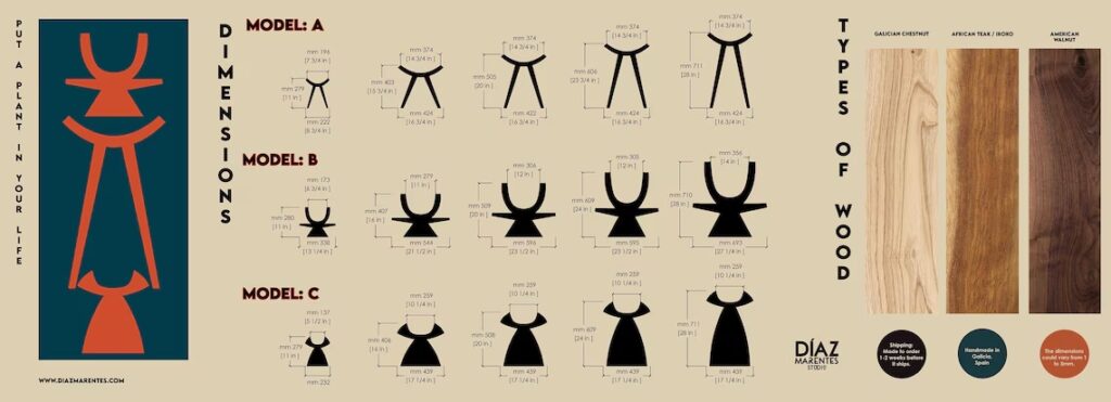 Los soportes para plantas estilo años 50 que muestro están diseñados y fabricados por Diaz Marentes Studio, un pequeño taller ubicado en la provincia de La Coruña, Galicia. Todas las piezas están hechas a mano en madera maciza, que puede ser de nogal americano (Juglans nigra), teca africana o iroko (Milicia excelsa) o variedades gallegas del castaño europeo (Castanea sativa).