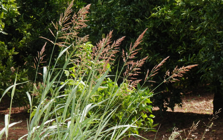 Desde mayo hasta octubre, esta gramínea relativamente grande (puede alcanzar los 2 metros) florece en los márgenes de los caminos en zonas de numerosos cultivos de regadío. Producto de una hibridación de introgresión con Sorghum bicolor, su inflorescencia tiene forma de espiguillas de color rojizo reunidas en grupos de 2 o 3.