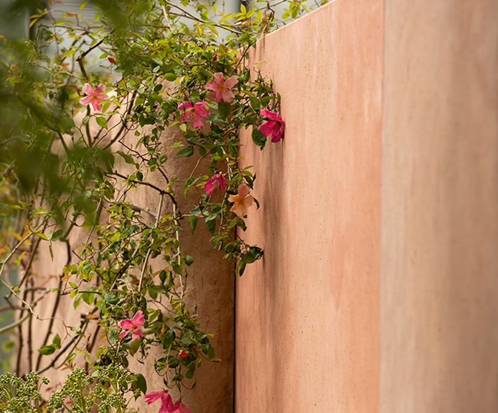 Grandes secciones de las paredes que sirven de telón de fondo a la plantación se hicieron con balas de paja, fijadas al lugar con varillas de avellano, que se enlucieron con mortero de cal tradicional.
