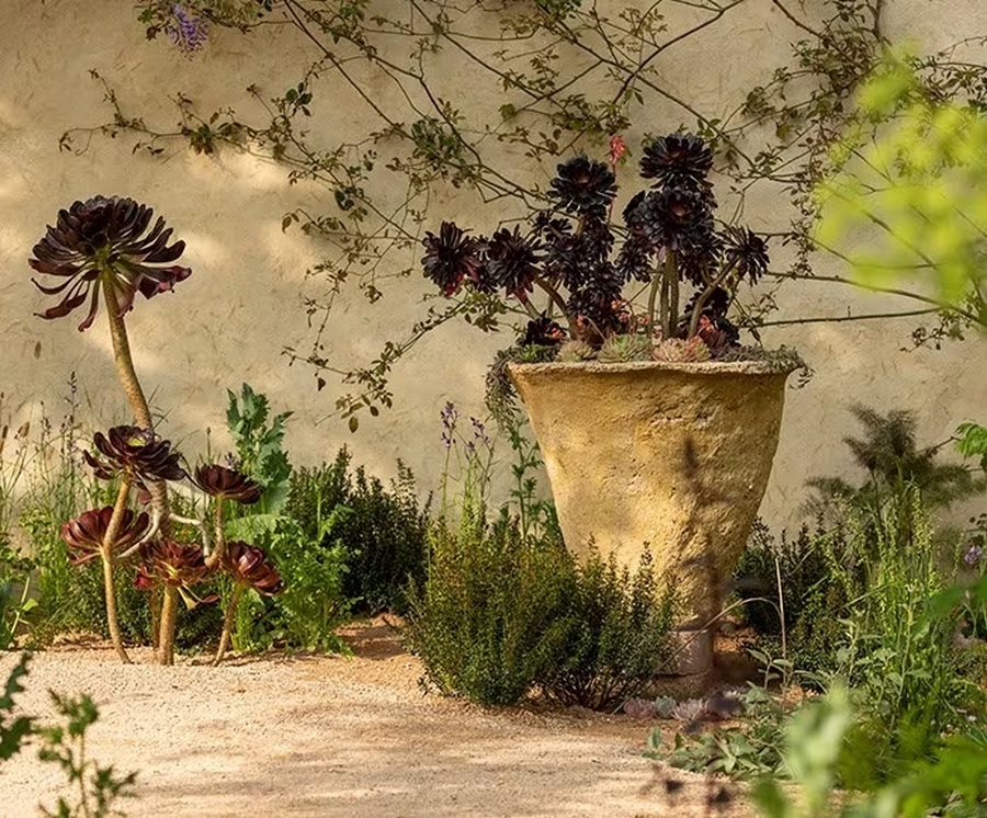La mezcla de tonos rosas ahumados, azules, amarillos y cremas, tienen su contraste con tonos más ricos, como el granate profundo de las rosetas de los aeoniums (Aeonium arboreum ‘Atropurpureum’) de tallo delgado que se encuentran en las macetas hechas a mano.