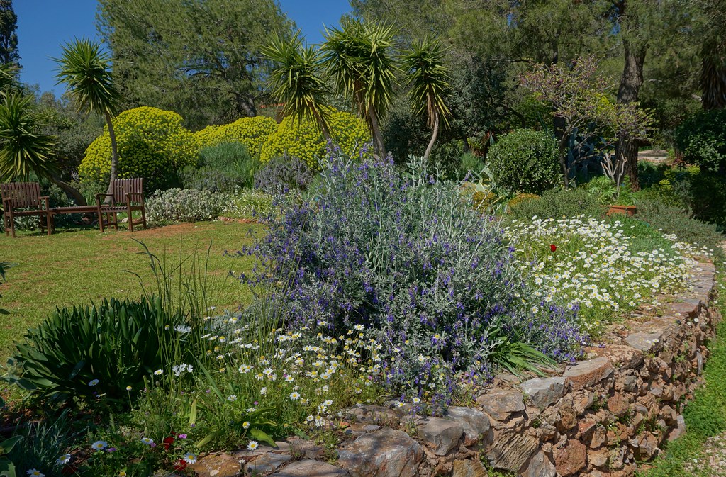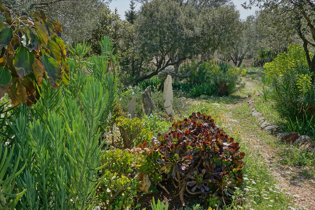 El jardín de Sparoza fue ideado por Jacky Tyrwhitt como un planteamiento plural. Quería un jardín mediterráneo tolerante a la sequía, pero pensó que un jardín plantado enteramente con especies locales podría carecer de color e interés durante los largos y calurosos meses de verano. Por eso, no dudo en incluir plantas no nativas, pero, eso sí, procedentes de otras regiones áridas del mundo.