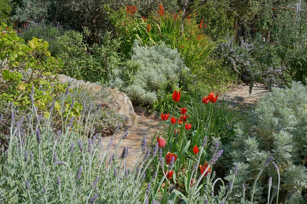 El jardín se compone de varias zonas distintas con diferentes plantas y necesidades de agua, pero cada área fluye naturalmente hacia la siguiente y hacia el paisaje más amplio.