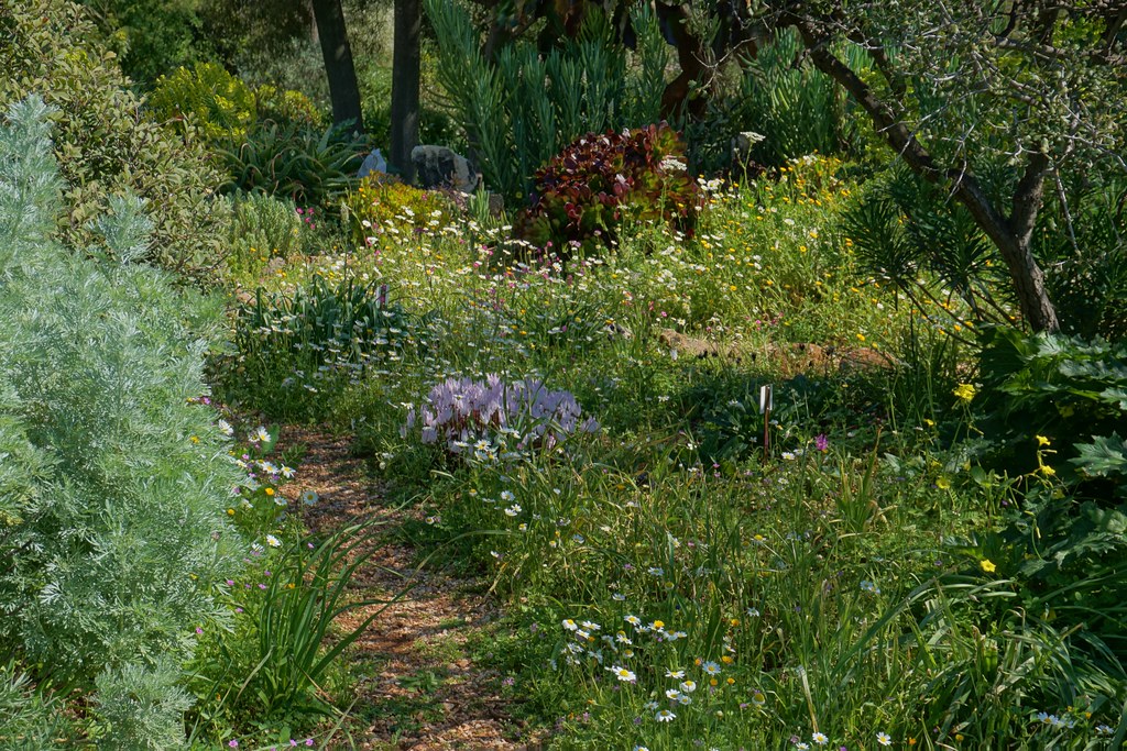 La parte principal del jardín se distribuye en una serie de tres terrazas largas orientadas al este, divididas en dos por un camino escalonado que conduce a la carretera privada. Estas terrazas están plantadas con una mezcla ecléctica de bulbos, plantas vivaces, arbustos y árboles pequeños. Abundan diferentes especies de Salvia, Teucrium, Lavandula y Euphorbia entre otras muchos géneros de plantas de clima mediterráneo.