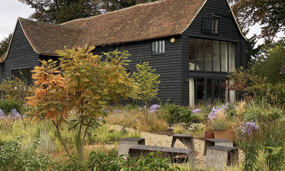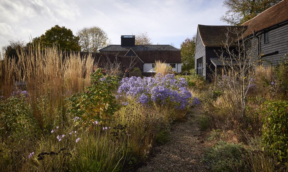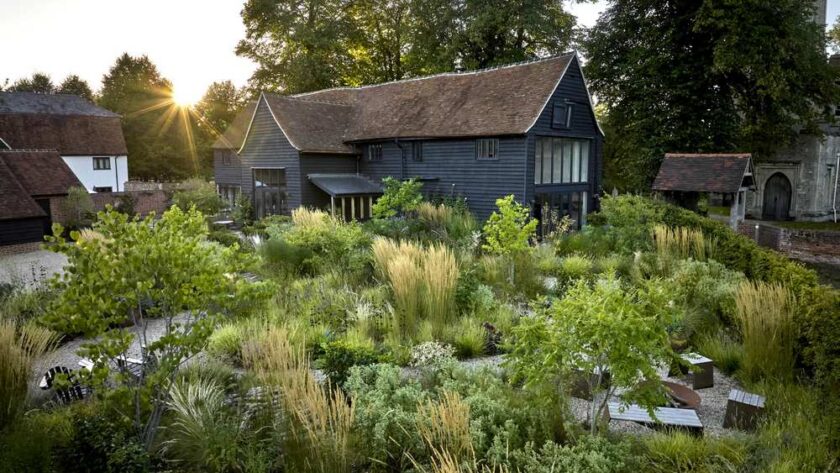 La amplia zona de césped situada en la parte trasera del edificio de Church Barn fue felizmente reemplazada por una importante área de plantación de vivaces diseñada para atraer la vida silvestre al jardín, con especies cuyas flores y frutos garantizan la visita de polinizadores e insectos benéficos.