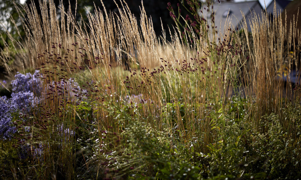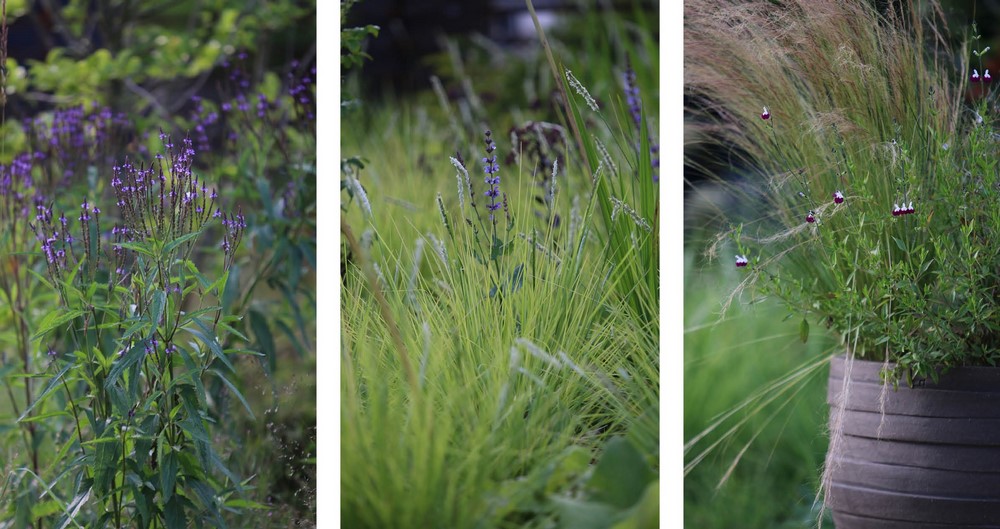 En pleno verano, además de Sesleria autumnalis, destacan otras gramíneas como Stipa ichu y Calamagrostis acutiflora ‘Karl Foester’, junto a vivaces como Hylotelephium ‘José Aubergine’, Agastache ‘Blue fortune’ y Sanguisorba canadensis .
