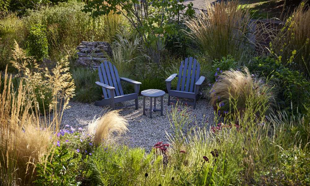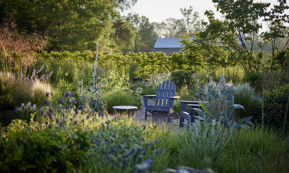 Uno de los senderos de grava conducen hasta una encantadora zona de descanso rodeada de la plantación naturalista, donde no faltan un par de sillas Adirondack para relajarse y disfrutar del paisaje circundante.