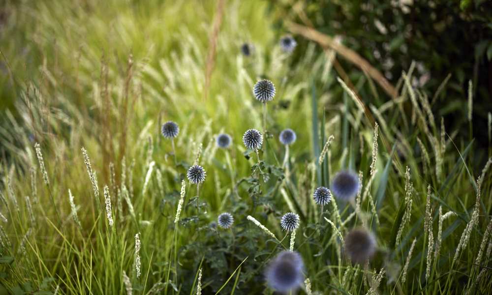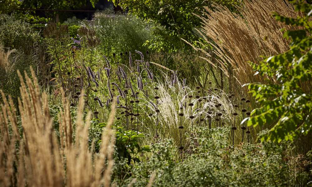 La plantación de estilo naturalista se sostiene con dos gramíneas ornamentales, Sesleria autumnalis y Sporobolus heterolepis, que dominan, unificando el diseño y creando la matriz en la que se han mezclado bulbosas y más de mil plantas vivaces, asegurando el interés a lo largo de las estaciones.