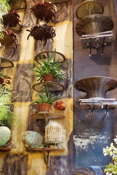Hay plantas tropicales y subtropicales, así como diversos objetos llenos de valor, por los años y por su belleza. Entre arreglos florales es fácil encontrar artísticas jaulas de pájaros. Las piezas de artesanía tradicional que diseña, las realizan después una red de artesanos expertos, utilizando materiales procedentes de la naturaleza.