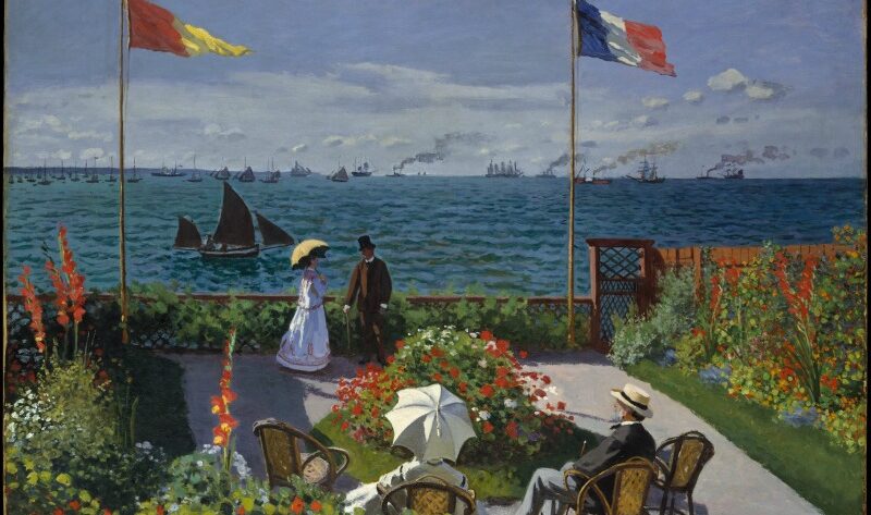 Es uno de mis cuadros favoritos de Monet y siempre me fascinó el enfoque y, por supuesto, la luz. Ha tenido muchos nombres y se ha mencionado «jardín» en numerosas ocasiones, pero terraza también. El cuadro, alojado en el Metropolitan Museum, aparece con el nombre de ‘Garden at Sainte-Adresse’ y con «jardín» nos quedamos, jardín inmerso en un paisaje marino que Monet nos brinda con auténtica maestría. Junto al mar y rodeando a la familia, gladiolos, geranios y capuchinas dan color a la escena, a una día de verano en la costa, en una villa que todavía existe, aunque reconstruida.