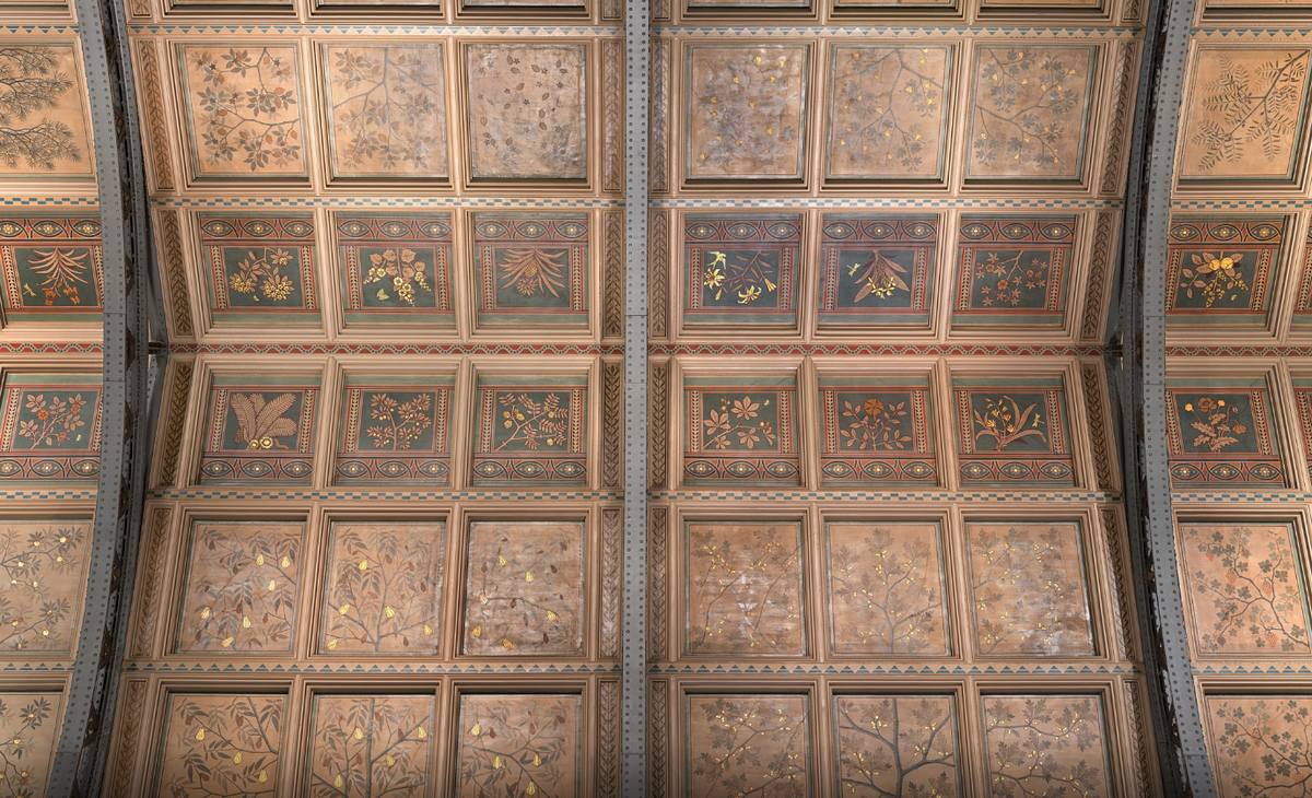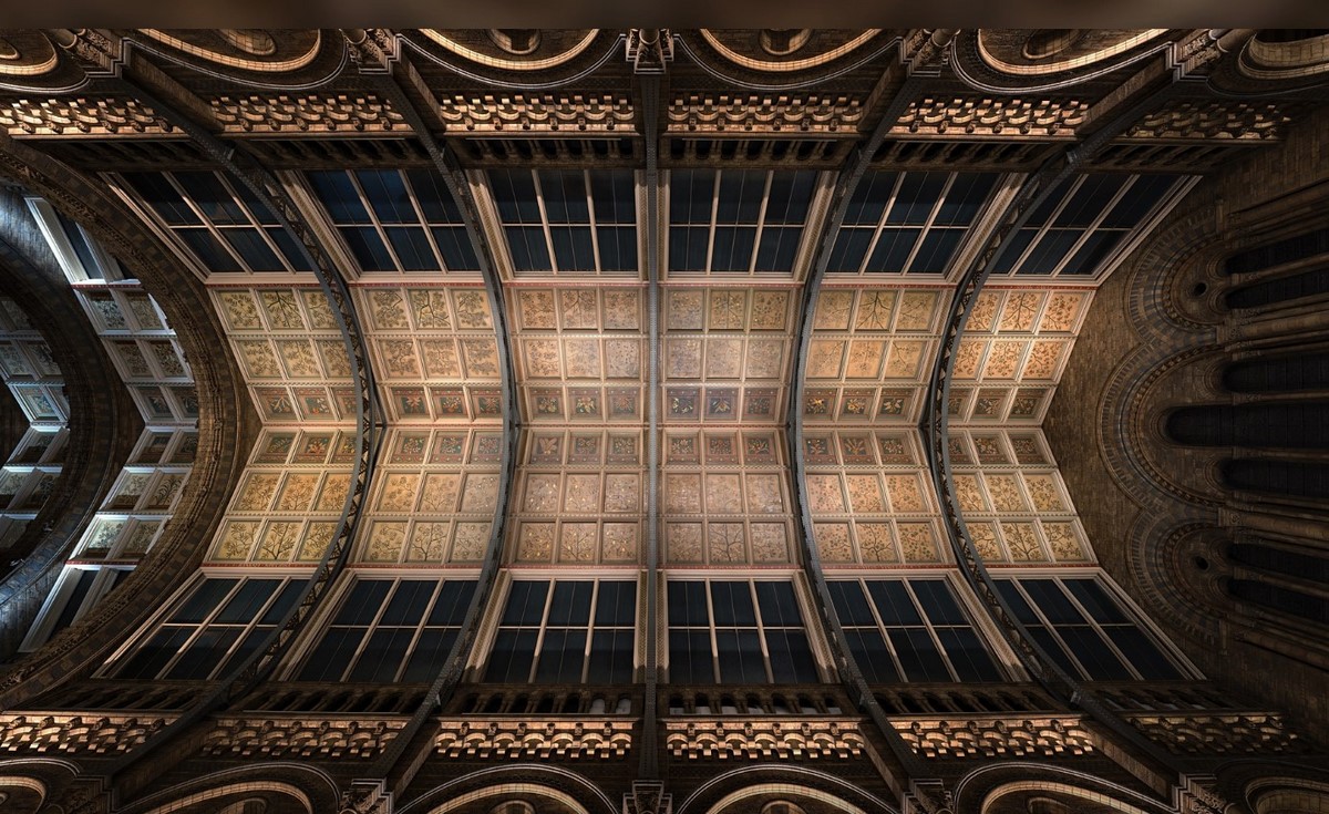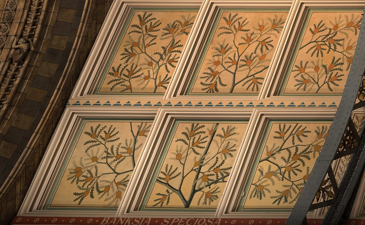 El extraordinario edificio, diseñado por Alfred Waterhouse, pretendía ser la «catedral de la naturaleza». Las plantas no podían faltar a esa cita arquitectónica. El museo comenzó a construirse en la década de 1870, una época en la que el Imperio Británico estaba en pleno apogeo y se extendía por todo el mundo. Esos 162 paneles dorados decorados conilustraciones botánicas datan de la época en que el museo abrió al público en 1881, por lo que se entiende que las especies botánicas que aparecen ilustradas en el techo representan la época victoriana, cuando los exploradores botánicos enviaban semillas y esquejes a Inglaterra y sus descubrimientos animaron a los jardineros victorianos a cultivar frutas y flores procedentes de todo el mundo. Este hecho justifica que en los paneles aparezcan mezcladas ilustraciones de plantas nativas y especies exóticas.