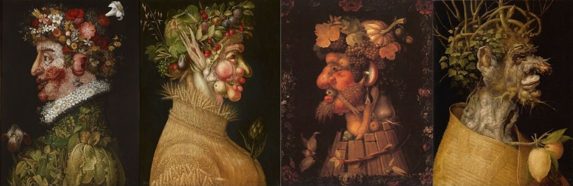 «Las Estaciones» de Giuseppe Arcimboldo. Desde la izda.: Primavera (1573), Verano (1573), Otoño (1573), Invierno, 1573