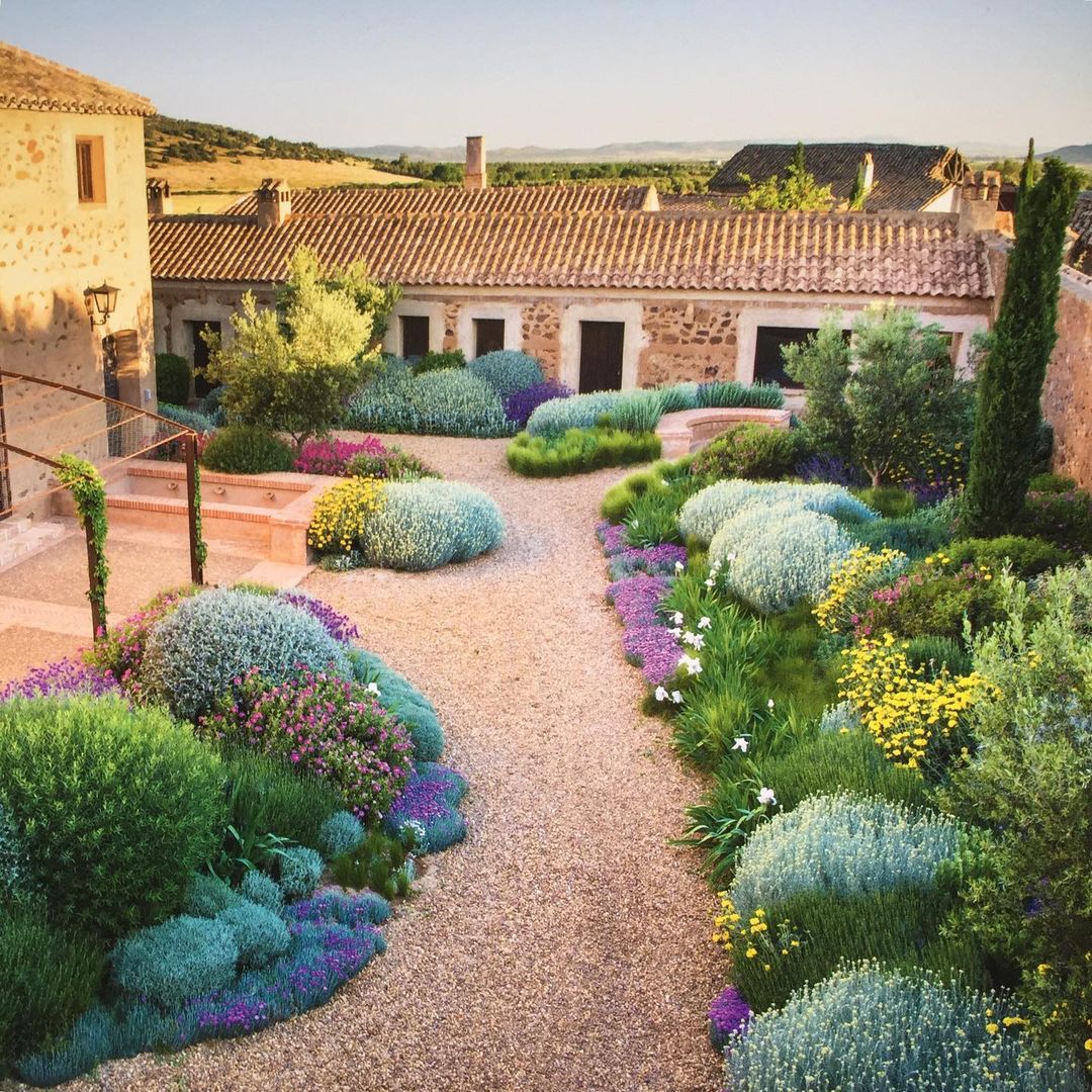 Por supuesto, hay más de una parada en los Jardines de España. La Granja de San Ildefonso ha servido para ilustrar apartados como el de los juegos de agua y el estilo jardín barroco. En el apartado dedicado a elementos como los cenadores, se incluye el del Jardín de la Concepción de Málaga. El Patio de los Naranjos junto a la Catedral de Sevilla es uno de los ejemplos que documentan el apartado de arboledas; y el reloj de sol del Jardín Botánico de Sóller en Mallorca ilustra ese aparatado. Pero también se detiene en jardines contemporáneos en España. En el apartado sobre los muros en el jardín, se muestra el muro de piedra seca que Miguel Urquijo construyó en un jardín ubicado en el Parque Nacional de Monfragüe. También ha habido una parada en su ya icónico jardín-patio en Consuegra, Toledo, que ha servido, entre otros modelos, para ilustrar a toda página el apartado dedicado a los patios.