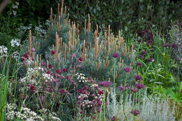 Aloe Polyphylla, pinos y plantas de la familia Asteraceae, además de Ligusticum scoticum, Lotus berthelotii, Luma apiculata y Corokia virgata, son algunas de las especies de plantas que destacan junto a vivaces en tonos violeta y púrpura, muchas de ellas propicias para favorecer la biodiversidad en el jardín, desde plantas que atraen polinizadores, hasta árboles que proporcionan anidación para las aves o una piscina que poco a poco es colonizada por libélulas, caracoles de agua y otras formas de vida acuática.