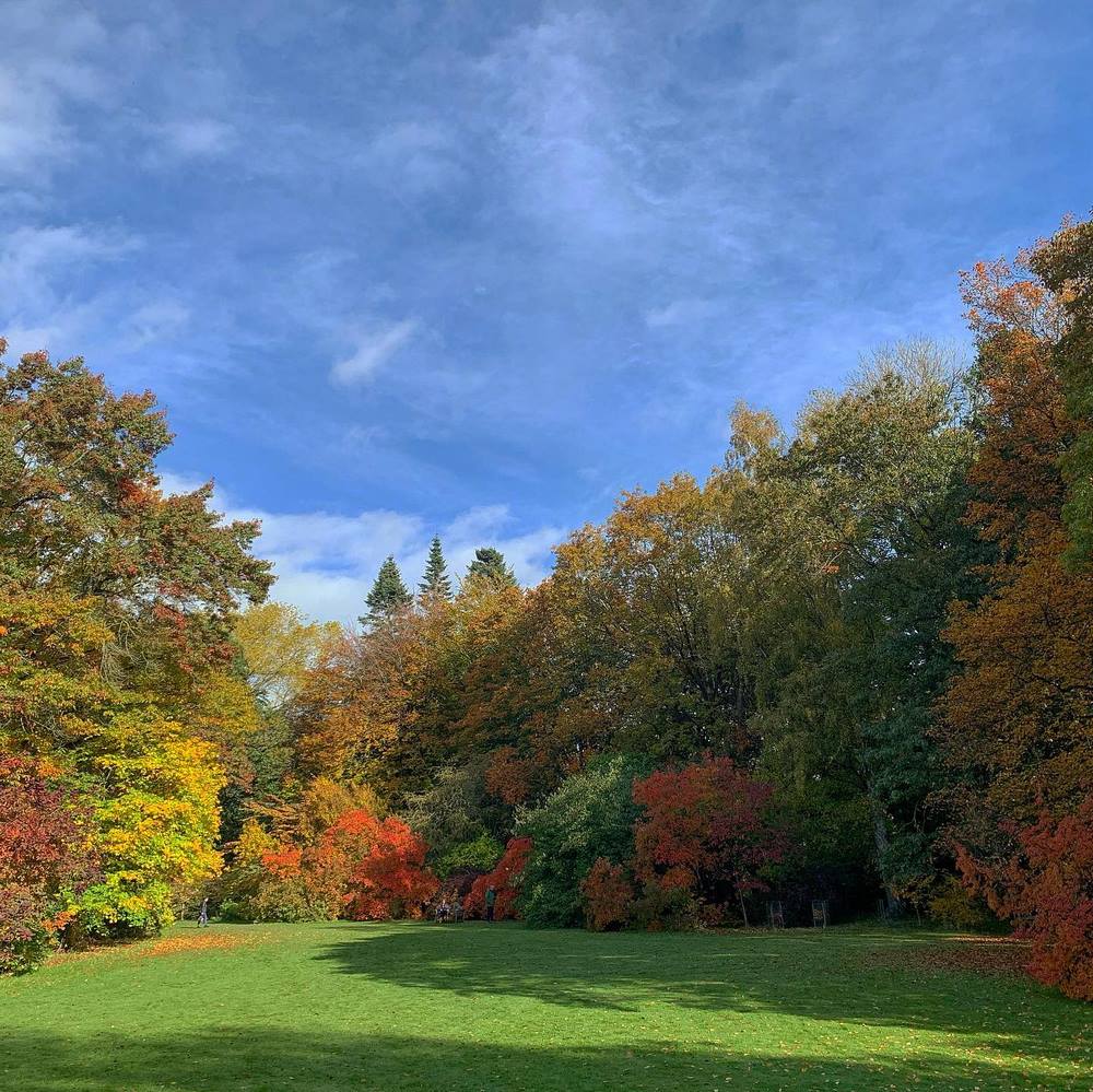 Pero el otoño llega triunfalmente y con sonido de trompetas. A lo largo de los meses de otoño, los cambios de color de las hojas encienden los senderos del bosque con un efecto dramático. La segunda quincena de octubre suele ser el momento álgido gracias a los arboles de hoja caduca que inundan encienden los caminos, entre los que destaca un ejemplar de abedul transcaucásico (Betula medwediewii) de 9 m de altura y un tronco de 0,4 m, con tallos múltiples y un llamativo color otoñal. Es uno de los 51 «árboles campeones», pero, campeones o no, hay más, ya lo creo que sí.