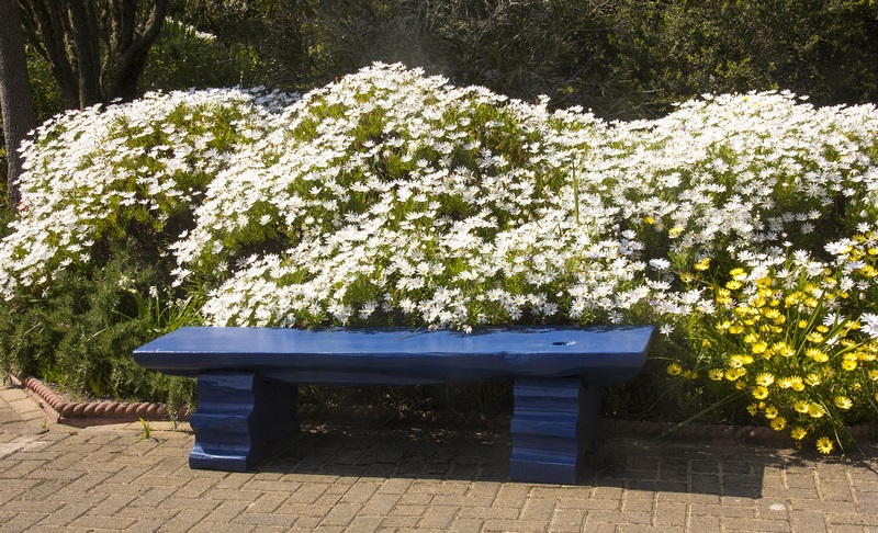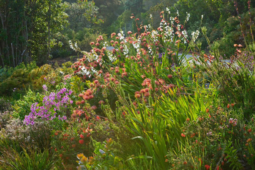Nada más cruzar el puente azul que da acceso al jardín, resulta evidente que no se trata del típico jardín inglés. Protea, Aloe, Cordyline y Dasylirion, entre otras especies, comienzan a darnos la pista de que nos vamos a encontrar con un jardín subtropical.