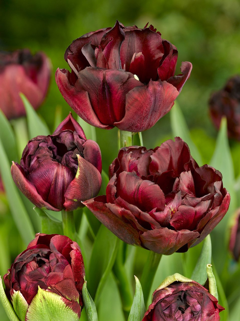 Los tulipanes dobles de floración tardíatambién son conocidos como ‘tulipán peonía’, ya que sus grandes pétalos y su delicioso perfume recuerdan mucho a las flores de la peonía. Las flores abren completamente y perfuman el aire a partir de mayo. Tienen los tallos más largos y las flores son mucho más grandes que las de los tulipanes dobles tempranos, pudiendo llegar a alcanzar fácilmente un diámetro de 10 cm, especialmente si están situados en un lugar al sol.