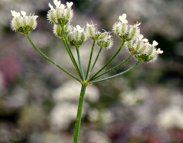 Realmente vistosa la inflorescencia en umbela de umbelas característica de la mayoría de las especies de la familia Umbeliferae (Apiaceae). Las flores abren secuencialmente. Primero las flores de las umbélulas más externas y después lo hacen las de las umbélulas internas. Florecillas muy uniformes con 5 pétalos y 5 estambres  En algunas especies, como es el caso de la zanahoria (Daucus carota) las flores marginales de las umbelas son irregulares y sirven como reclamo para los insectos.