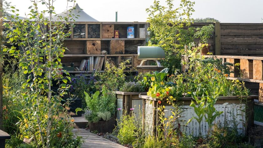 De este modo, el jardín ofrece inspiración sobre cómo reutilizar objetos para usarlos en nuestro jardín, ya sea para darle una nueva vida a algunos muebles en el exterior, recuperar materiales de construcción o incluso equipos agrícolas. Las tablas de andamios viejos, por ejemplo, encuentran una nueva vida como camino elevado y plataforma, y los paneles de radiadores recuperados forman las paredes de las camas elevadas para cultivar flores silvestres y plantas comestibles.