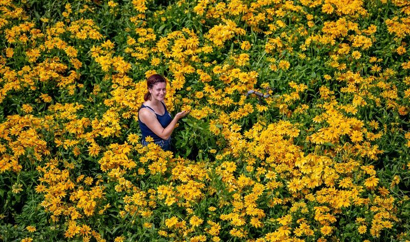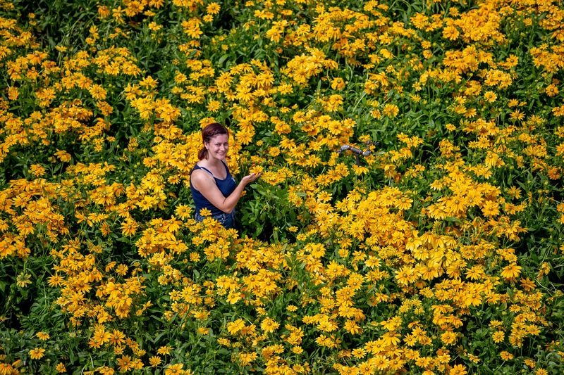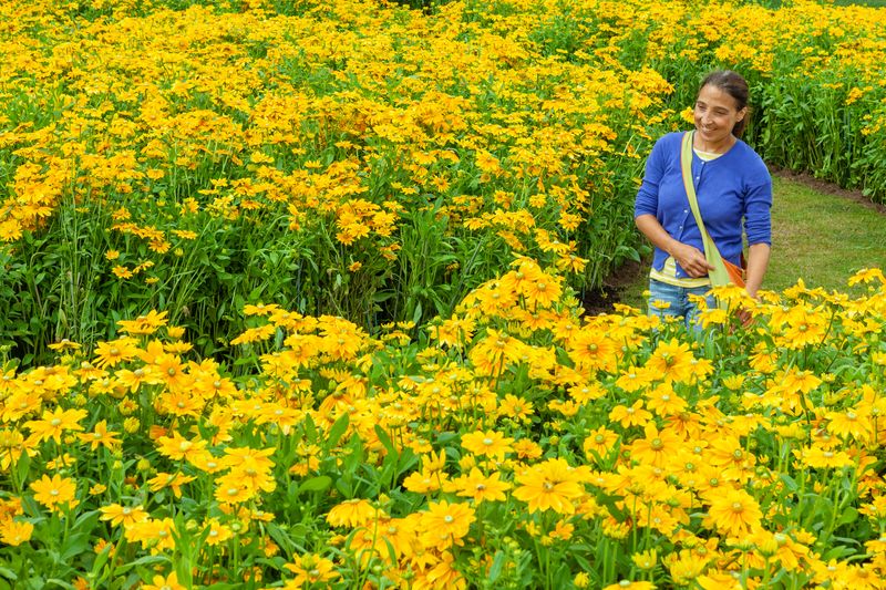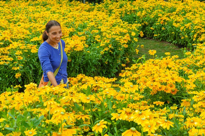 ¿Qué nos vamos a encontrar en esta ocasión? Lo más llamativo, un mar de flores o, mejor dicho, un campo de margaritas de flores grandes como soles, el de la plantación en masa de 5.000 rudbeckias (Rudbeckia hirta ‘Praire Sun’) que se han dispuesto de tal forma que permiten que los visitantes puedan caminar a través de ellas, haciendo pensar que te encuentras en una pradera de flores norteamericana. Tenéis más detalles sobre este género de plantas y esa variedad en concreto aquí.