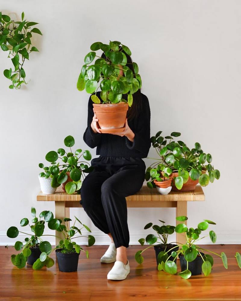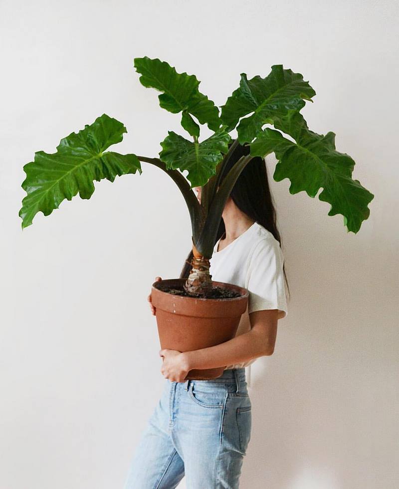 Su planta favorita es Strelitzia nicolai, pero en su estudio veremos también vistosas plantas verdes, como Alocasia ‘Low Rider’, Philodendron “Xanadu” o Pilea peperomioides.